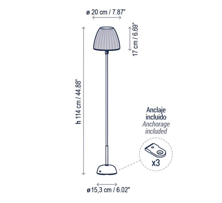 Son design discret intègre un abat-jour tissé à la main en fibres synthétiques recyclables avec un diffuseur en polyéthylène résistant aux UV, le tout reposant sur une tige fine en aluminium.