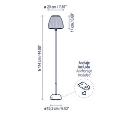 Elle fonctionne avec une batterie rechargeable et offre trois niveaux d’éclairage (33 %, 66 %, 100 %) avec une autonomie allant jusqu’à 12 heures à pleine puissance. Elle est classée IP54 pour résister aux projections d’eau et est conçue pour un usage extérieur. L’abat-jour mesure 20 cm de diamètre et 17 cm de hauteur, tandis que l’ensemble atteint une hauteur de 114 cm avec une base d’environ 15,3 cm de diamètre.