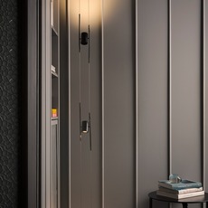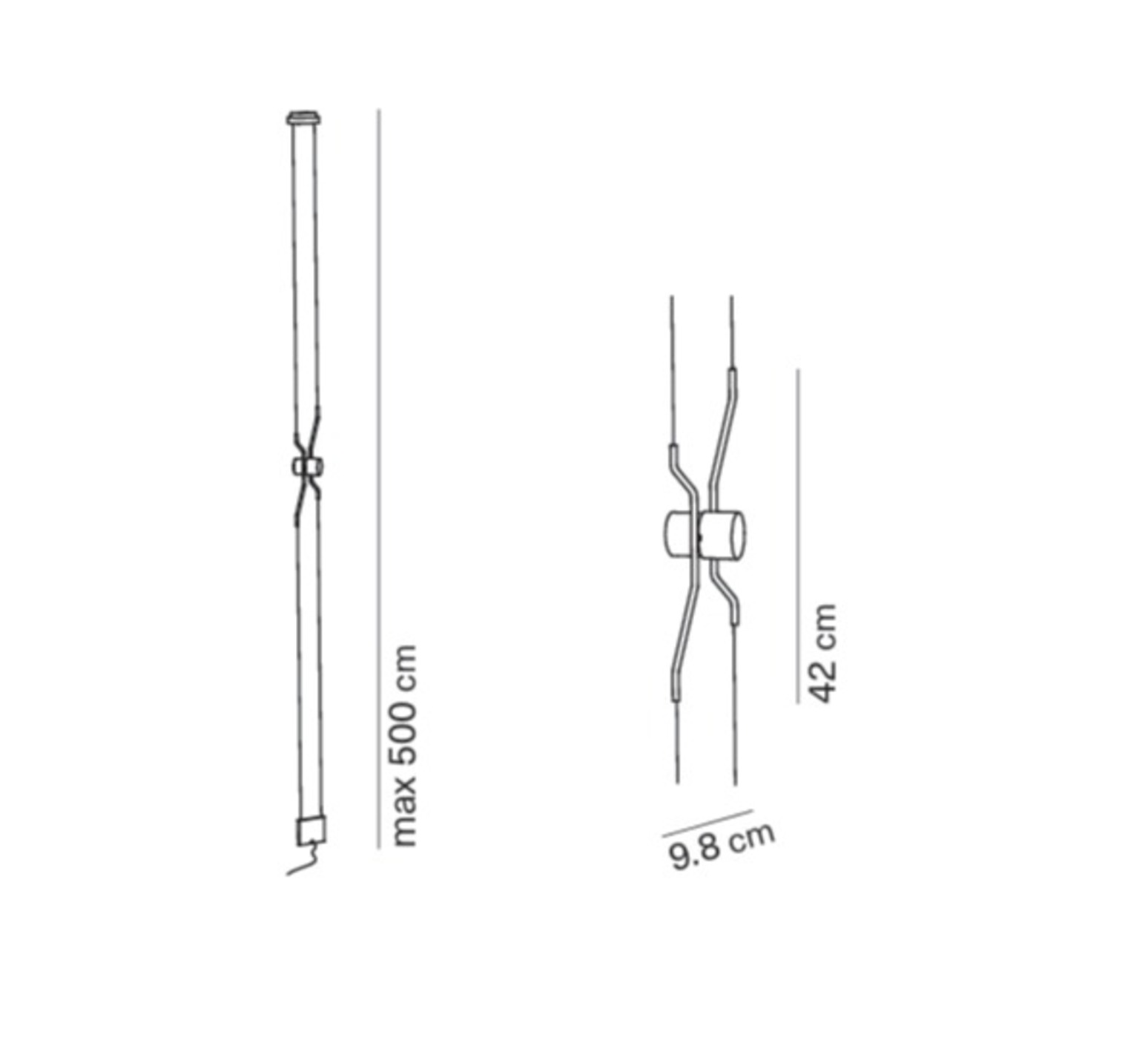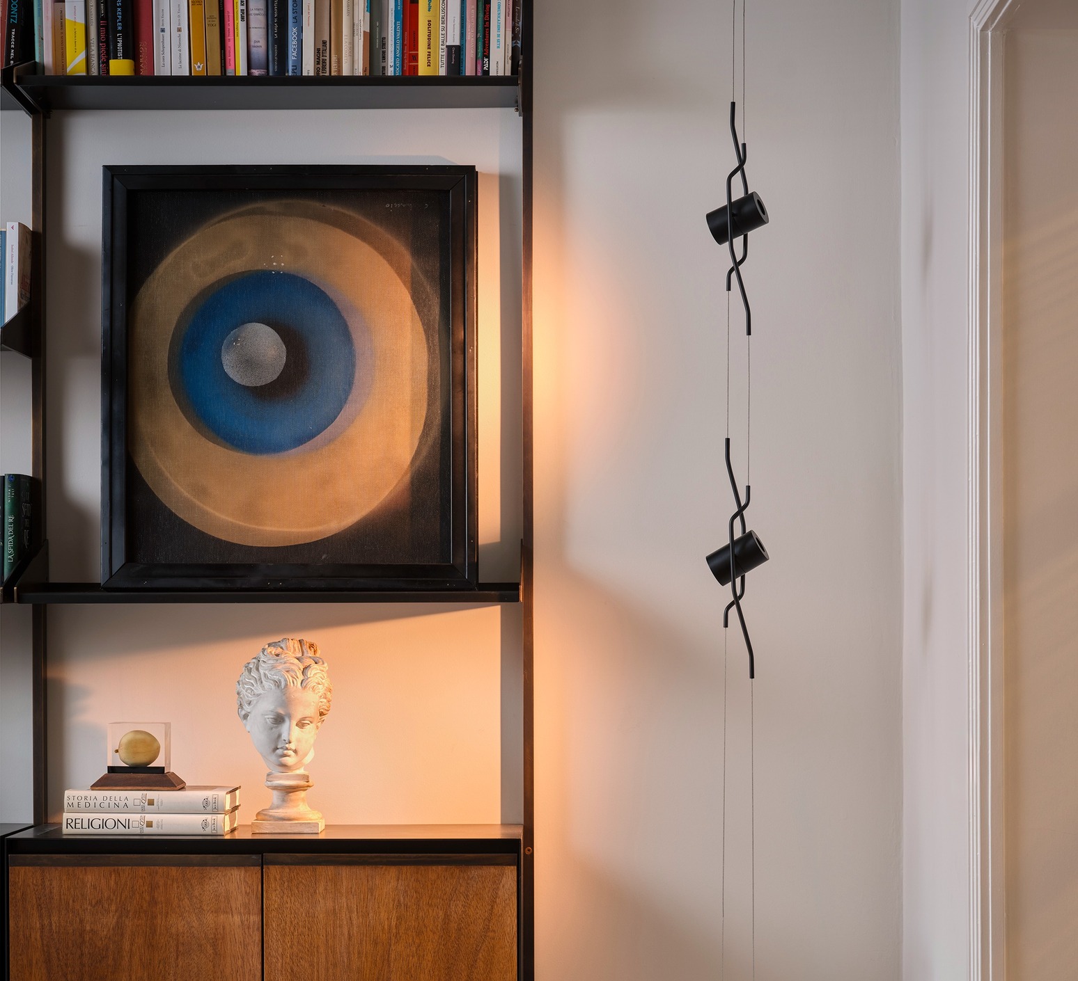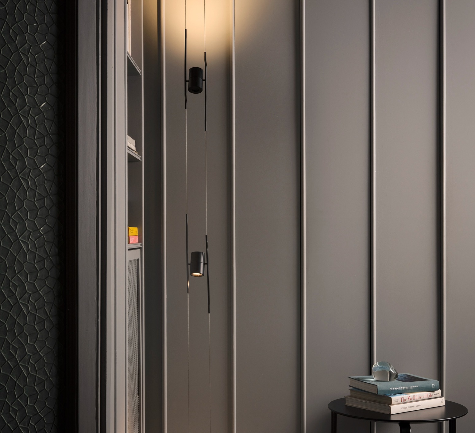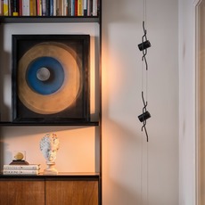 Deux câbles tendus entre le sol et le plafond dessinent un axe vertical précis sur lequel les deux spots cylindriques coulissent librement. Les diffuseurs noirs en métal se déplacent, s’arrêtent et s’orientent selon les besoins, sans ajout de structure visible. La lumière semble suspendue dans l’espace, idéale pour souligner un mur, accompagner un passage ou créer un point lumineux ciblé dans un intérieur contemporain. Le lampadaire suspendu Tendu s’intègre aussi bien dans un espace minimal que dans une architecture plus classique, en apportant une présence discrète et maîtrisée.