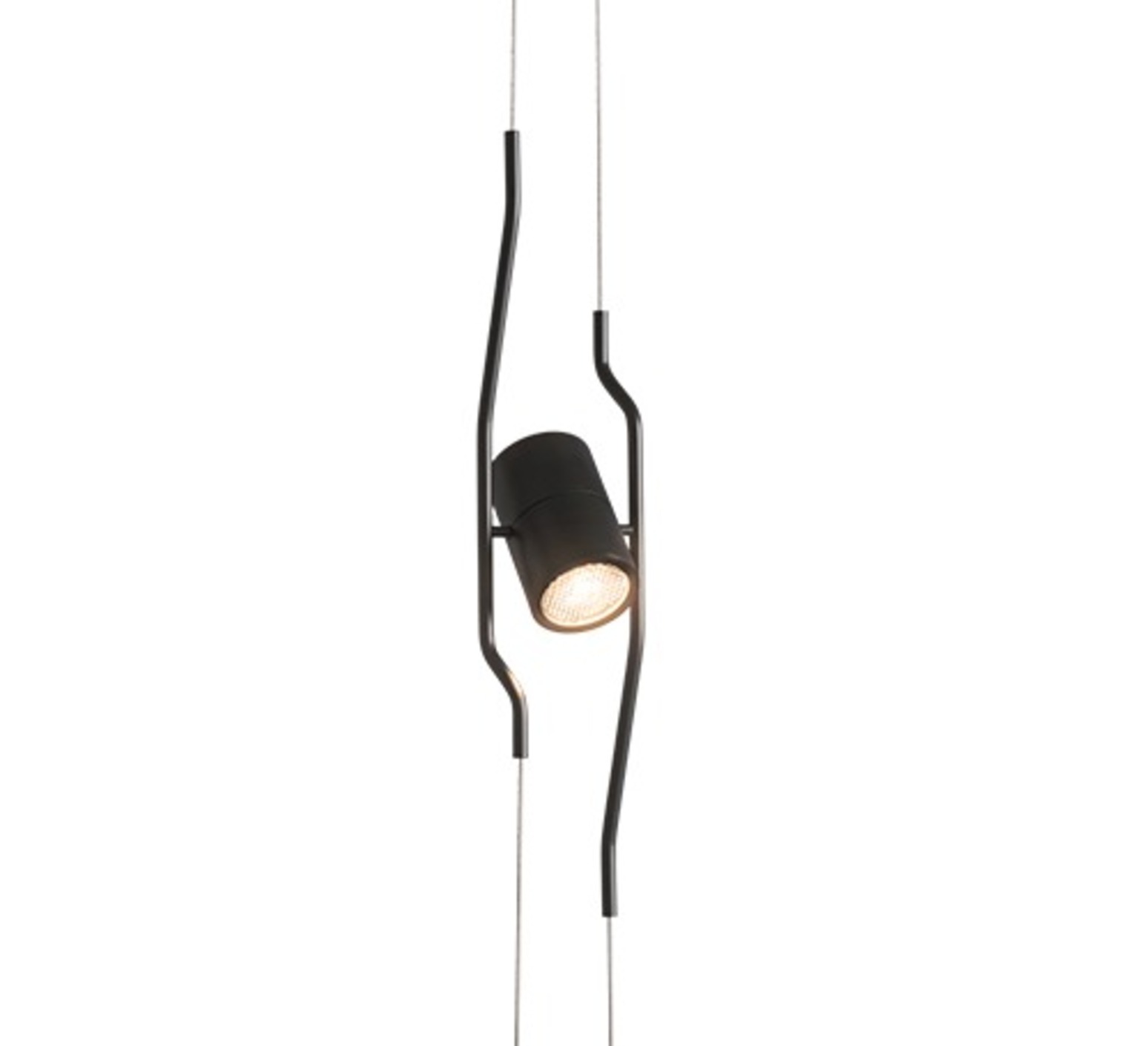 Ce lampadaire suspendu intègre deux modules LED de 12W délivrant 2400 lumens au total en 3000K, avec un éclairage direct précis et un IRC supérieur à 90. Les spots orientables glissent sur des câbles en acier à basse tension qui assurent également l’alimentation, sans câble additionnel. La structure en métal noir est équipée d’un câble d’alimentation gris allant jusqu’à 5 mètres avec prise et variateur intégré. Dimensions du spot : L 9,8 cm, H 42 cm. Fixation au plafond incluse. Version avec deux spots, existe également avec un seul spot.