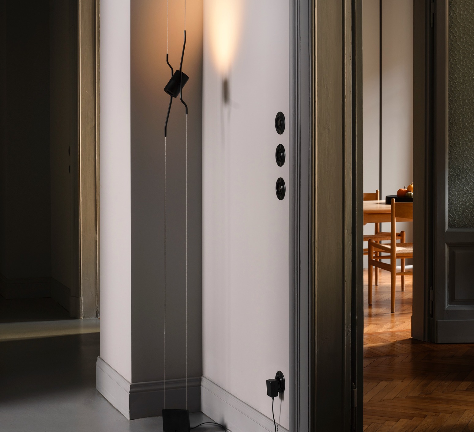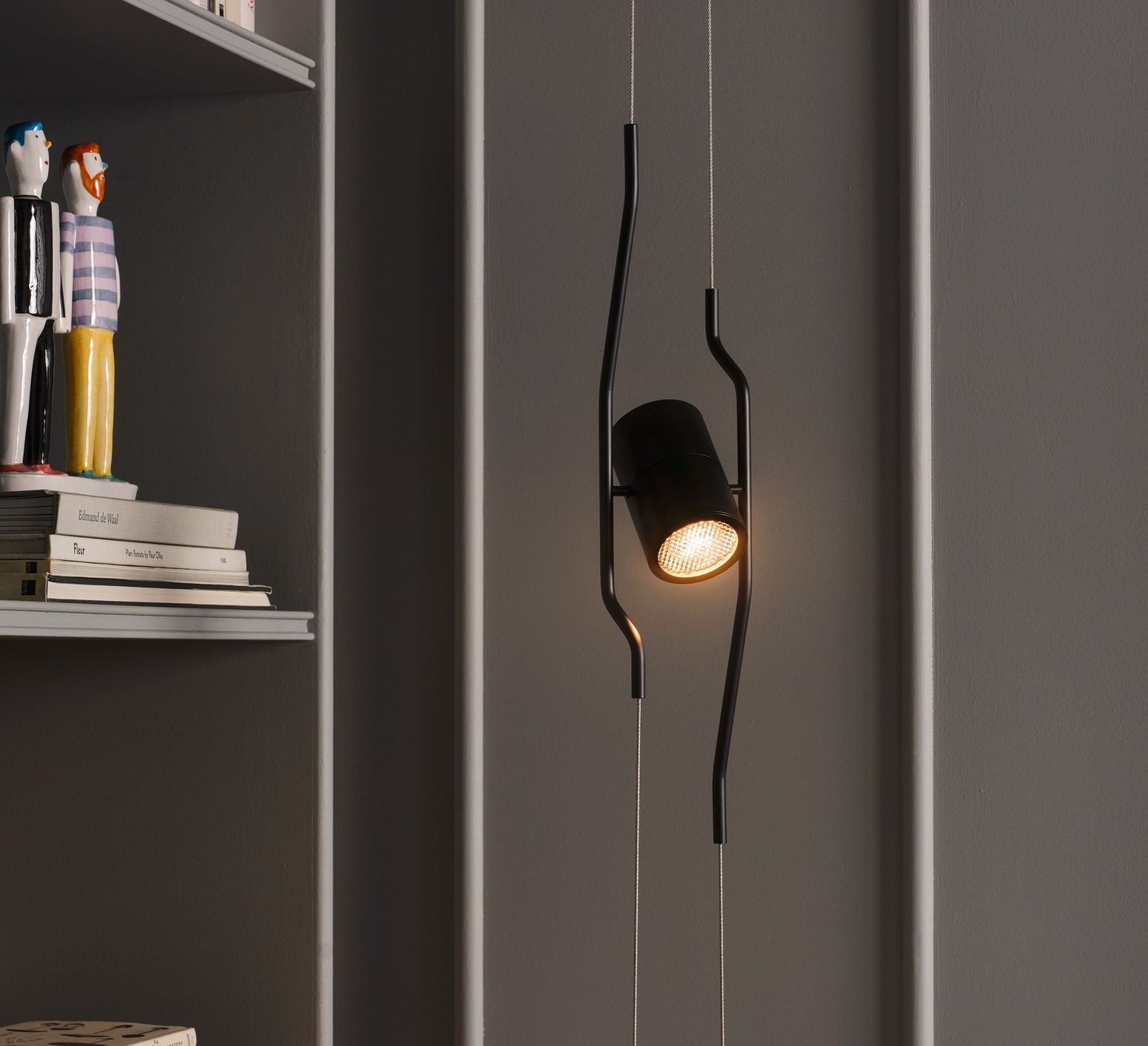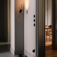 Deux câbles tendus entre le sol et le plafond dessinent un axe vertical précis sur lequel le spot cylindrique coulisse librement. Le diffuseur noir en métal se déplace, s’arrête et s’oriente selon les besoins, sans ajout de structure visible. La lumière semble suspendue dans l’espace, idéale pour souligner un mur, accompagner un passage ou créer un point lumineux ciblé dans un intérieur contemporain. Le lampadaire suspendu Tendu s’intègre aussi bien dans un espace minimal que dans une architecture plus classique, en apportant une présence discrète et maîtrisée.