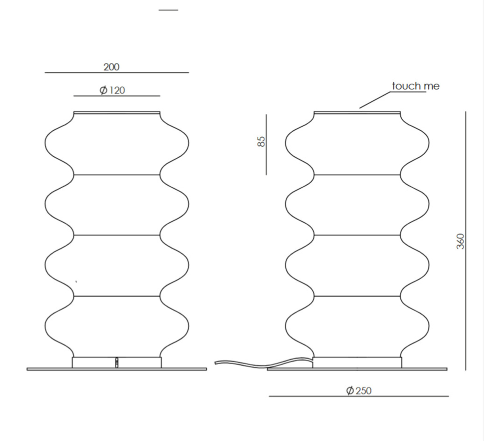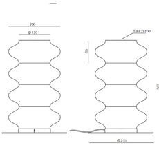 D’un diamètre de 25 cm et d’une hauteur de 36 cm, la lampe intègre un module LED de 12 W diffusant une lumière chaude de 2700 K pour un flux lumineux de 2000 lm, avec un éclairage diffus à 360° garantissant un excellent confort visuel. Elle est dimmable TRIAC et permet de faire varier l’intensité simplement en touchant le haut de la lampe, pour adapter l’ambiance à chaque moment. Le câble d’alimentation assure une installation flexible et discrète dans l’espace.