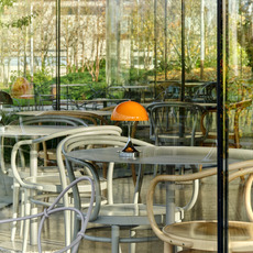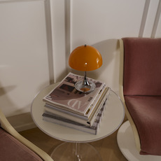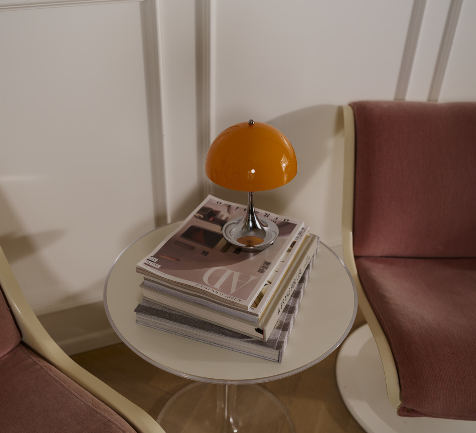 Cette version compacte reprend fidèlement le dessin iconique du designer, où pied et abat-jour agissent comme réflecteurs. Elle se distingue par son coloris orange opale et son écrou supérieur chromé brillant, signature visuelle du modèle.