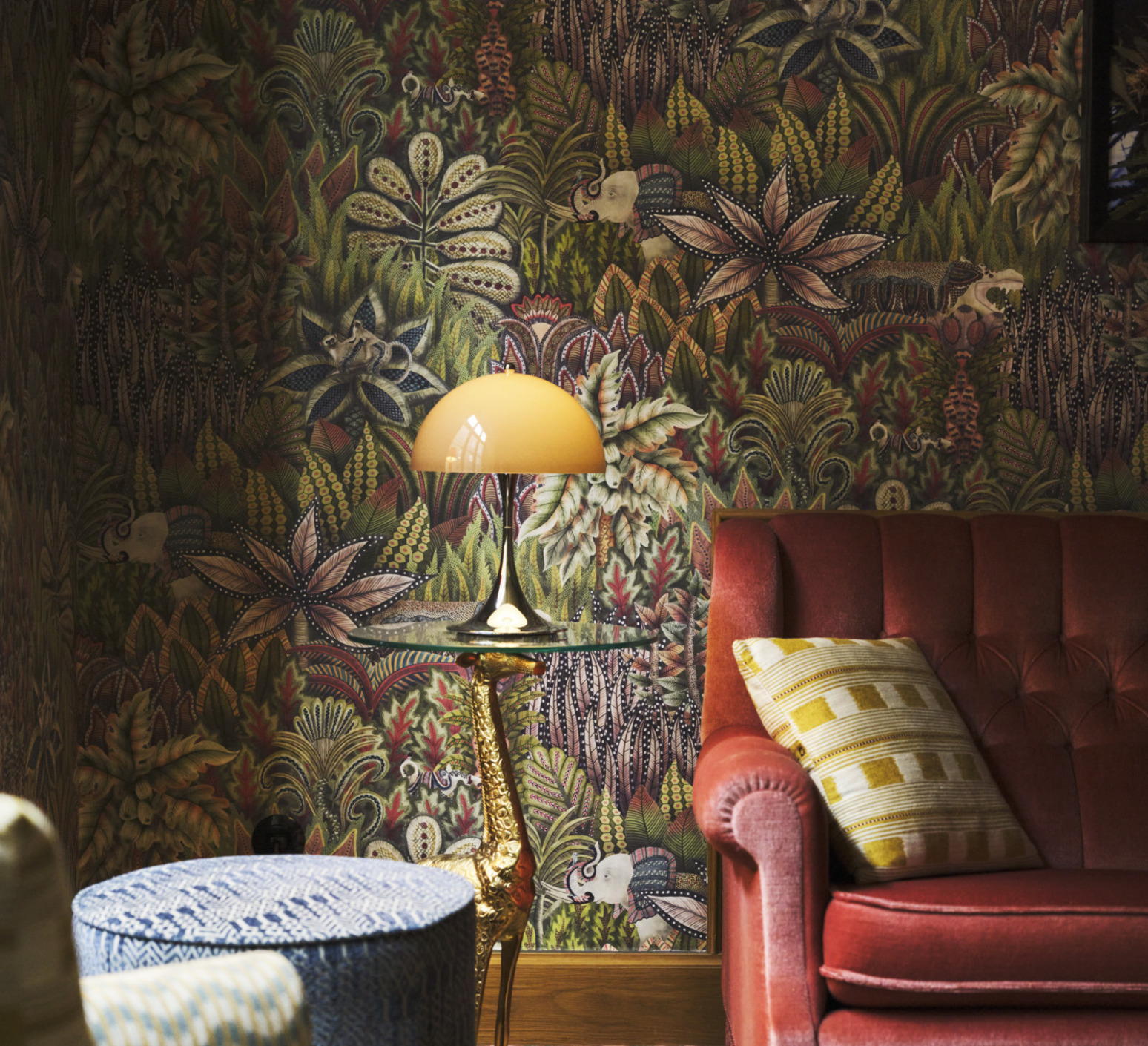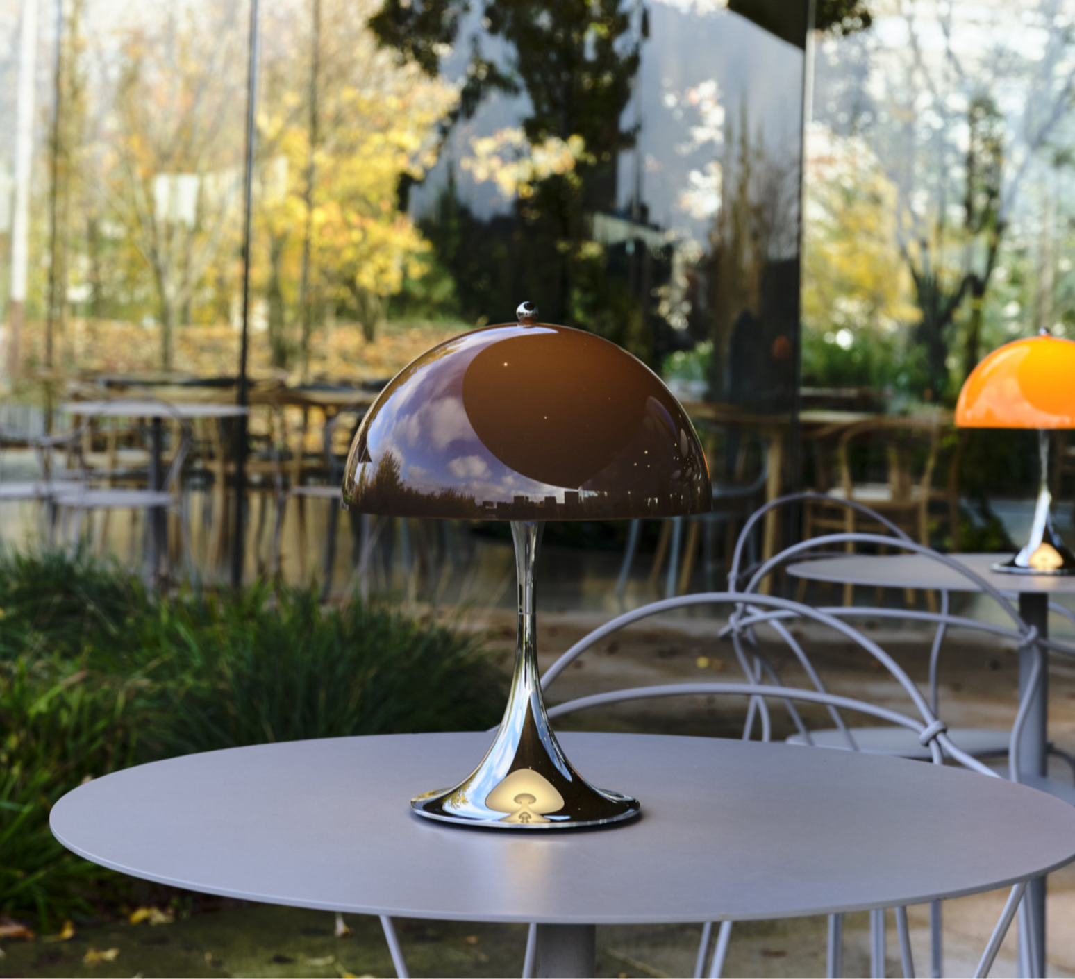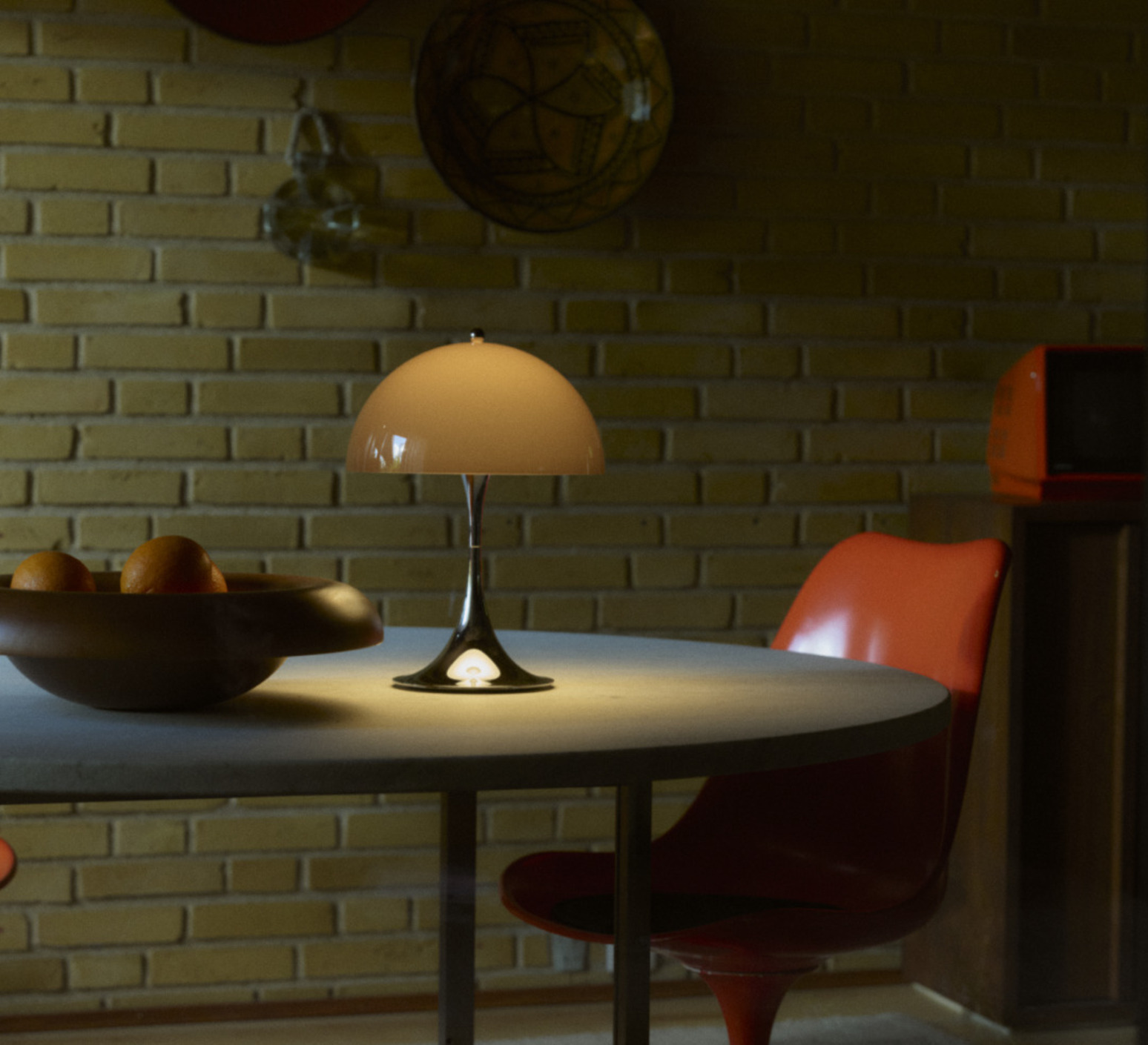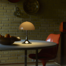 Sa silhouette sphérique généreuse structure l’espace et diffuse un éclairage doux à 360°. Elle s’utilise en lampe d’appoint sur une table basse, une terrasse couverte ou un rebord large grâce à sa protection IP44. La teinte orange opale réchauffe les palettes neutres, dialogue avec le bois, le métal brossé ou la pierre, et fonctionne en contraste dans un décor minimaliste. En composition avec plusieurs tailles Panthella, elle crée un ensemble lumineux cohérent et graphique.