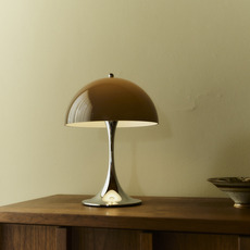Cette version portable grand format reprend le principe fondateur du design : abat-jour et pied servent de réflecteurs pour produire une lumière d’ambiance régulière. Elle associe un abat-jour marron opale et un écrou supérieur chromé brillant, signature de la série.
