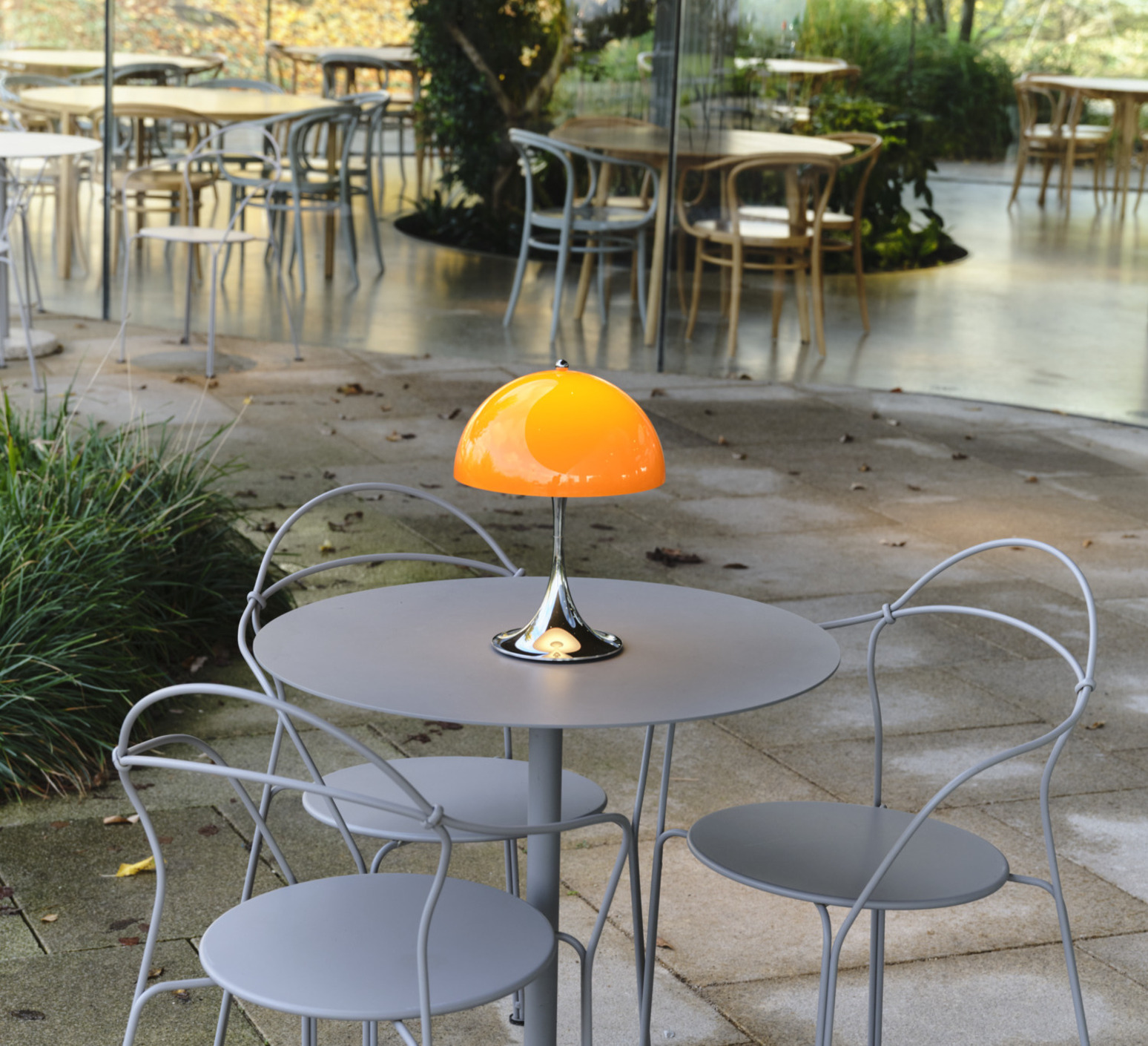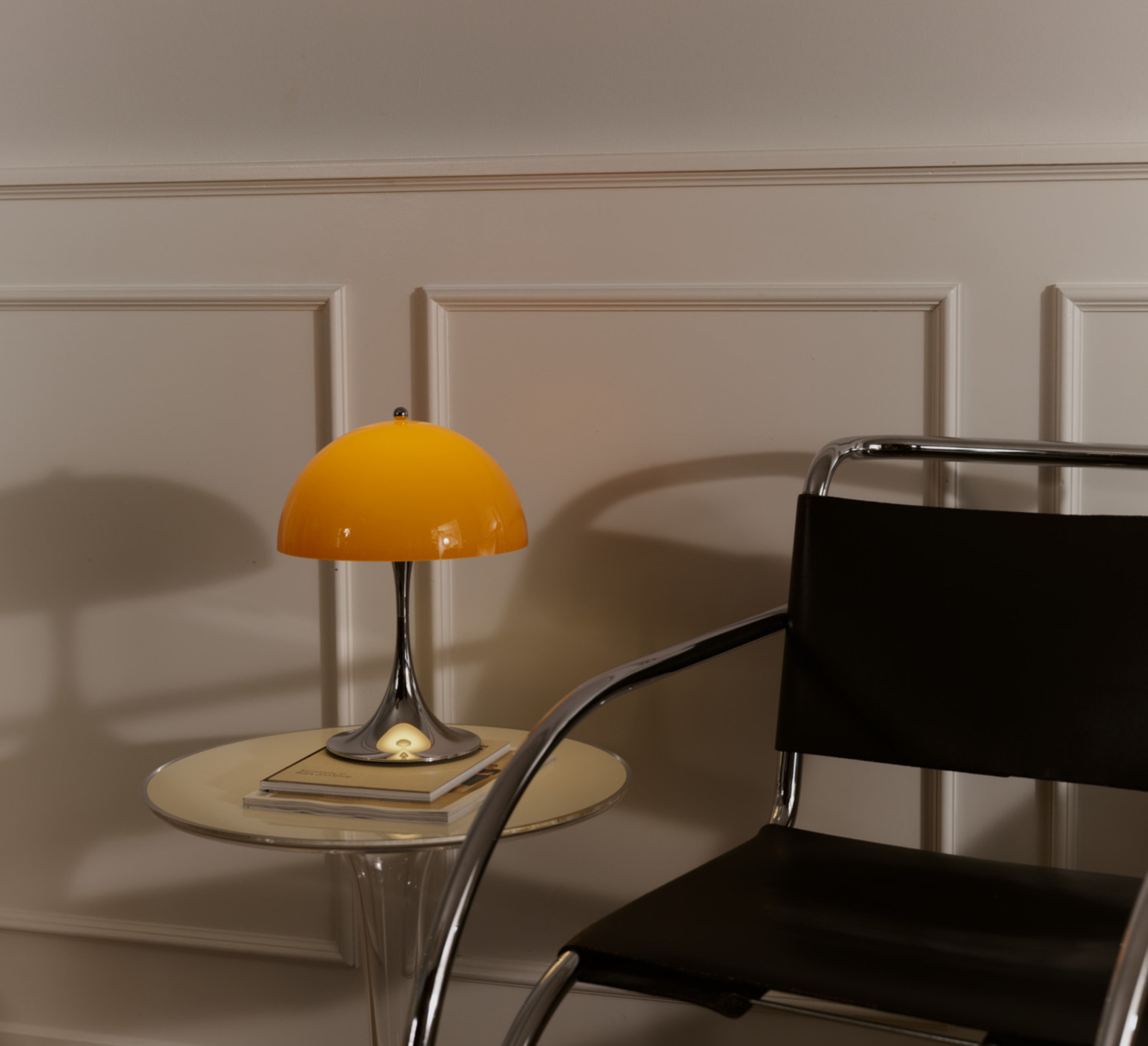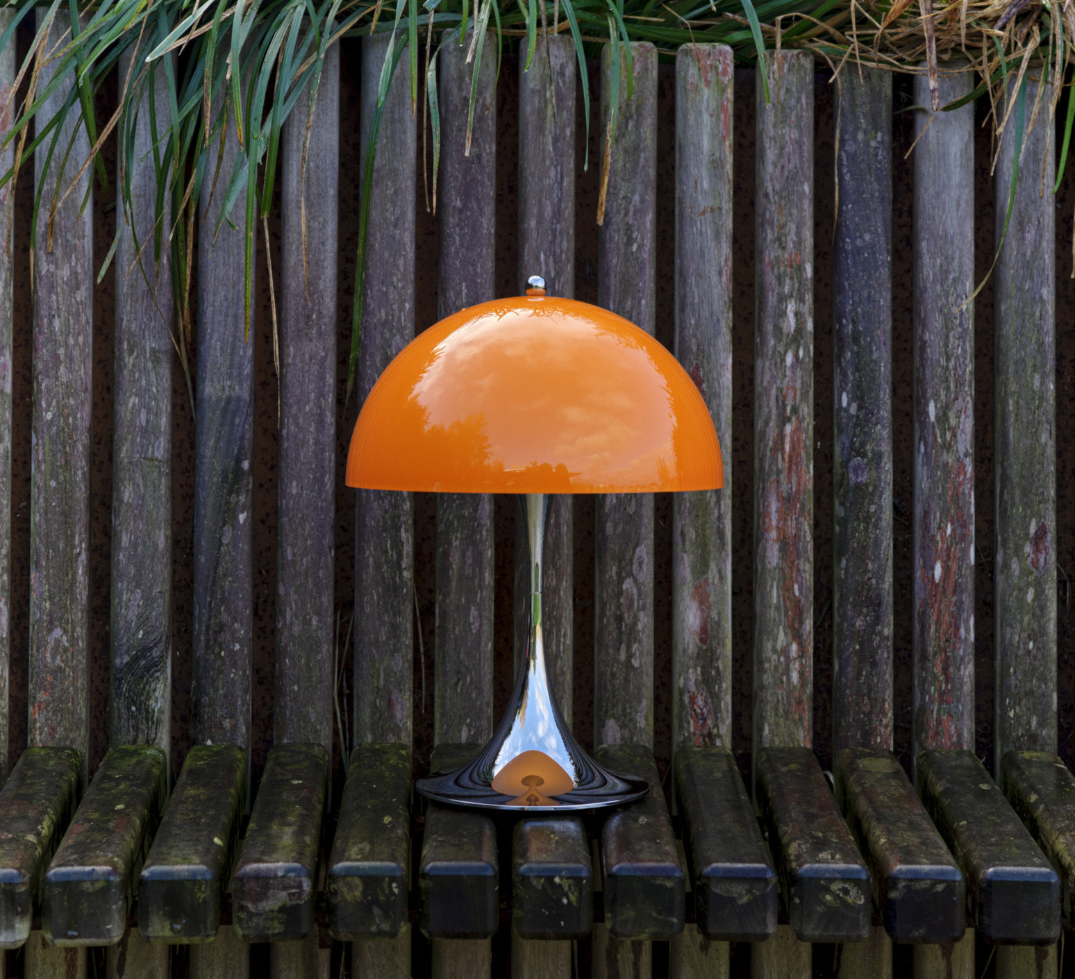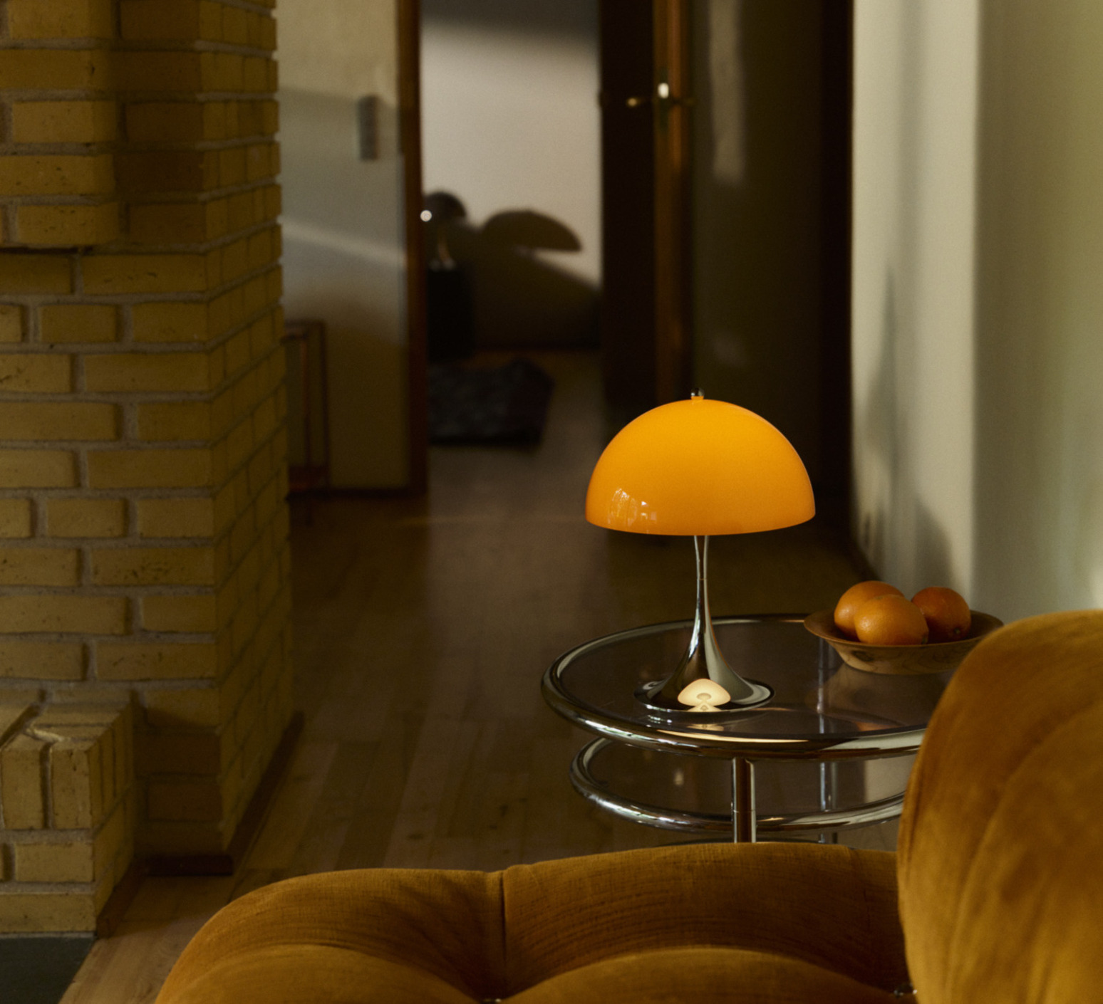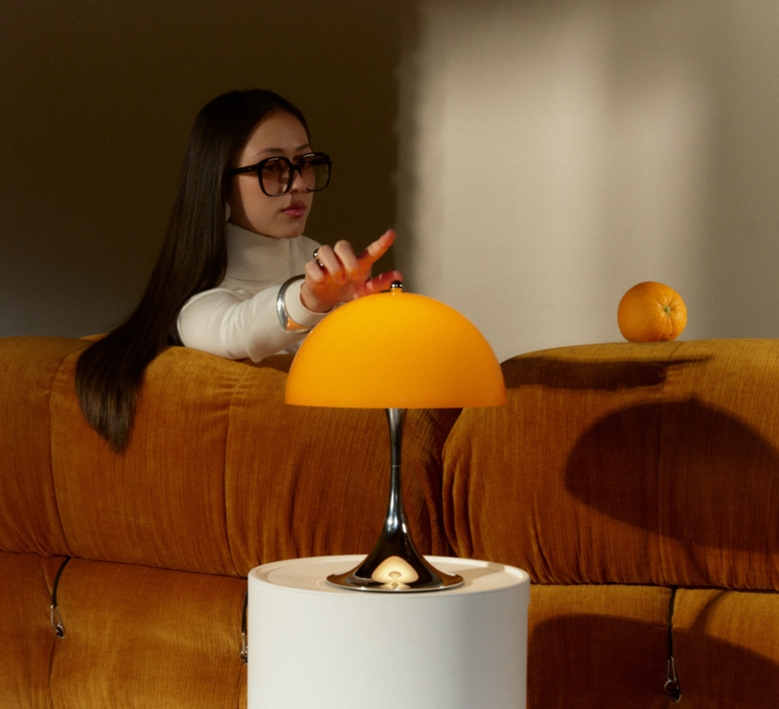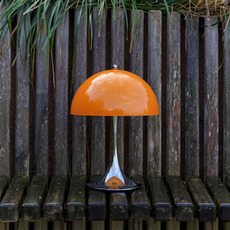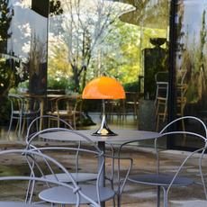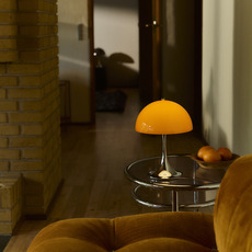 Sa silhouette sphérique généreuse structure l’espace et diffuse un éclairage doux à 360°. Elle s’utilise en lampe d’appoint sur une table basse, une terrasse couverte ou un rebord large grâce à sa protection IP44. La teinte orange opale réchauffe les palettes neutres, dialogue avec le bois, le métal brossé ou la pierre, et fonctionne en contraste dans un décor minimaliste. En composition avec plusieurs tailles Panthella, elle crée un ensemble lumineux cohérent et graphique.
