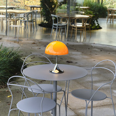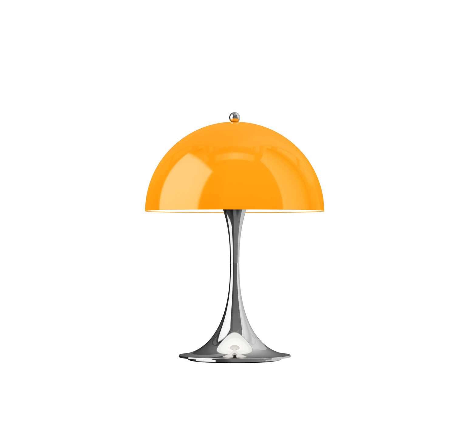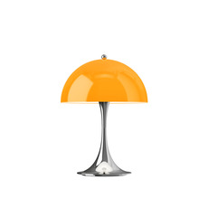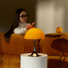 Cette version portable grand format reprend le principe fondateur du design : abat-jour et pied servent de réflecteurs pour produire une lumière d’ambiance régulière. Elle associe un abat-jour orange opale et un écrou supérieur chromé brillant, signature de la série.