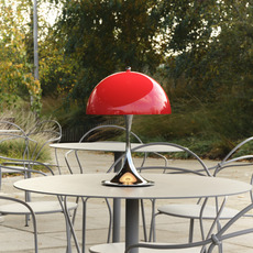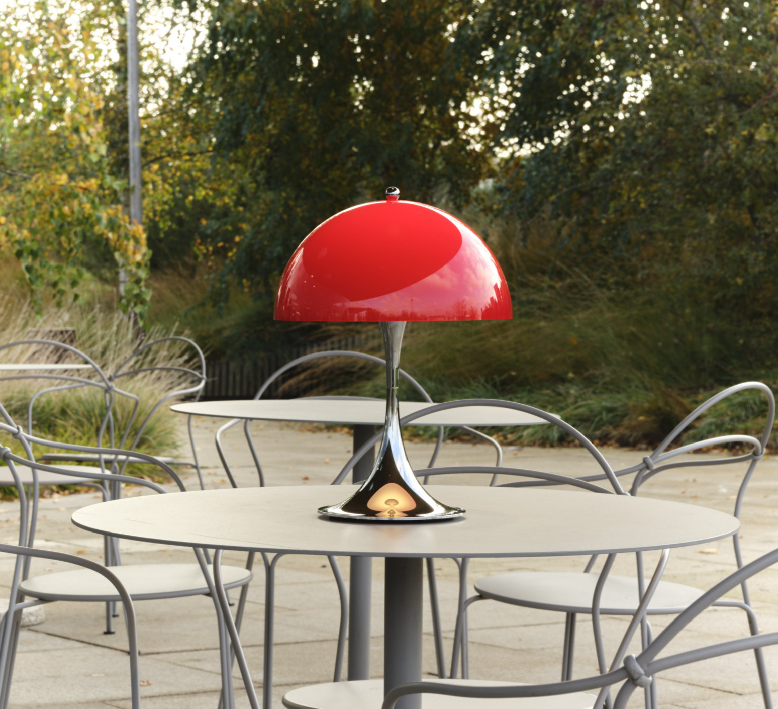 Sa silhouette sphérique généreuse structure l’espace et diffuse un éclairage doux à 360°. Elle s’utilise en lampe d’appoint sur une table basse, une terrasse couverte ou un rebord large grâce à sa protection IP44. La teinte orange opale réchauffe les palettes neutres, dialogue avec le bois, le métal brossé ou la pierre, et fonctionne en contraste dans un décor minimaliste. En composition avec plusieurs tailles Panthella, elle crée un ensemble lumineux cohérent et graphique.