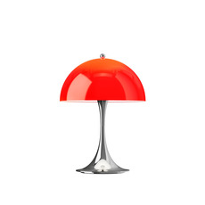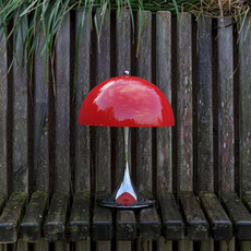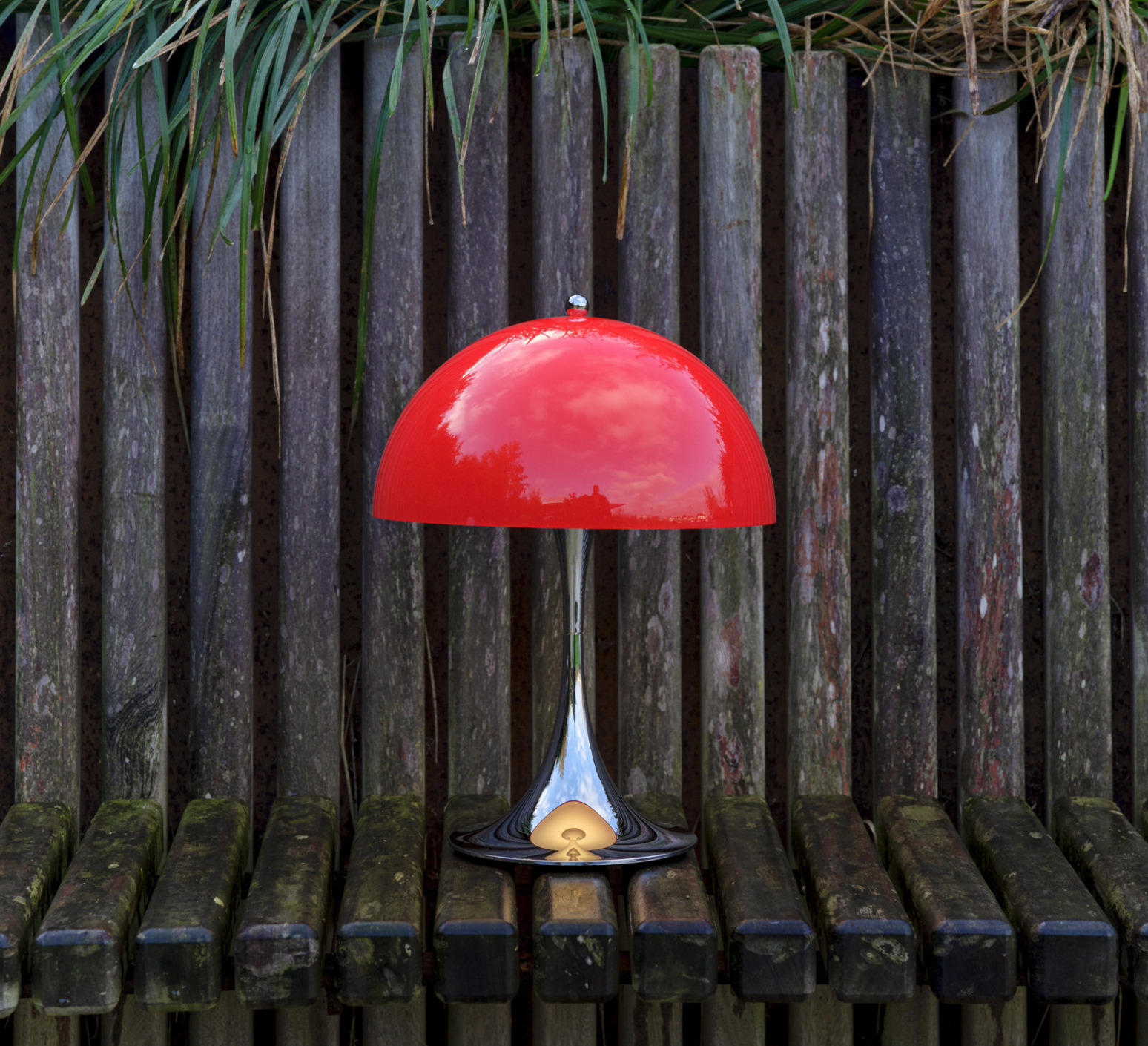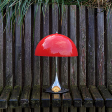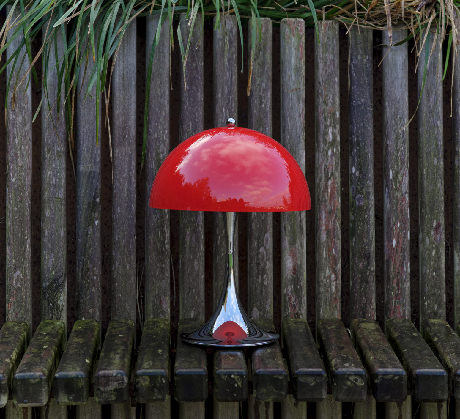 Cette version portable grand format reprend le principe fondateur du design : abat-jour et pied servent de réflecteurs pour produire une lumière d’ambiance régulière. Elle associe un abat-jour rouge opale et un écrou supérieur chromé brillant, signature de la série.