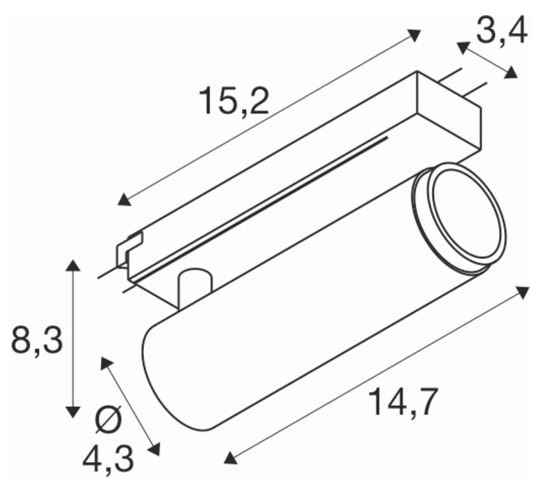 Il mesure 4,3 cm de diamètre et 14,7 cm de hauteur. Sa source lumineuse diffusant 2000 à 3000K est incluse. Compatible avec les systèmes sur rail monophasé et triphasé. Dimmable triac.