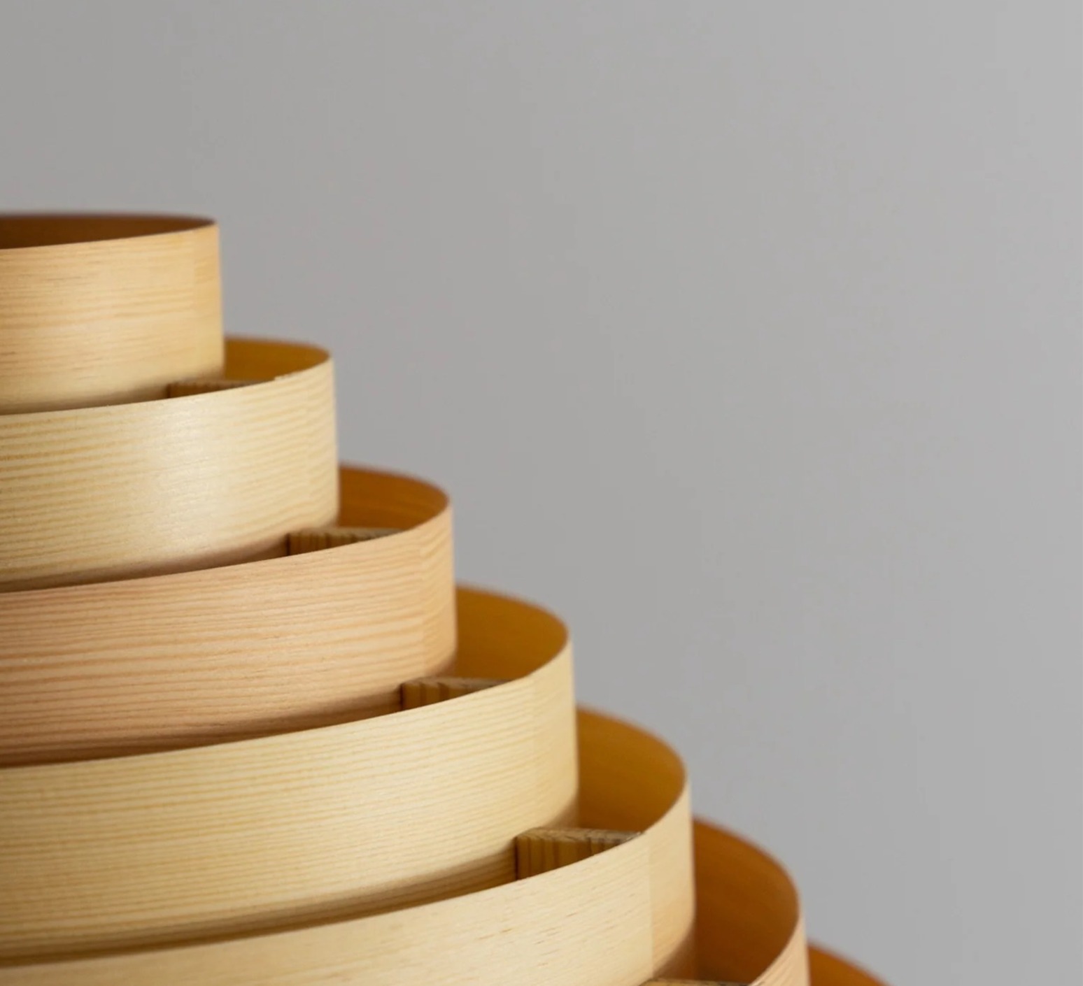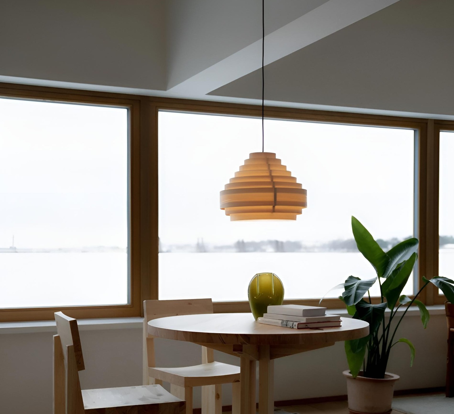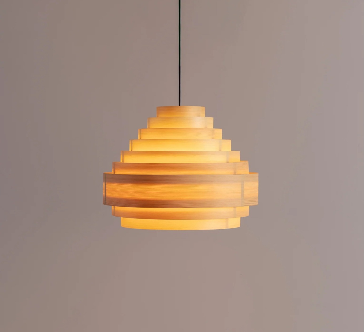 Lorsque la lumière s’échappe à travers les bandes de bois, elle crée une lueur douce et mielleuse qui met en valeur la texture du grain, évoquant à la fois la tradition du design nordique et une modernité organique intemporelle.