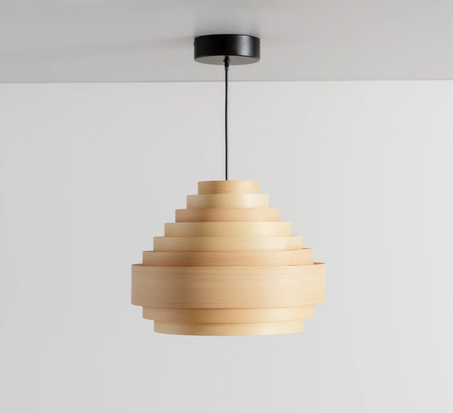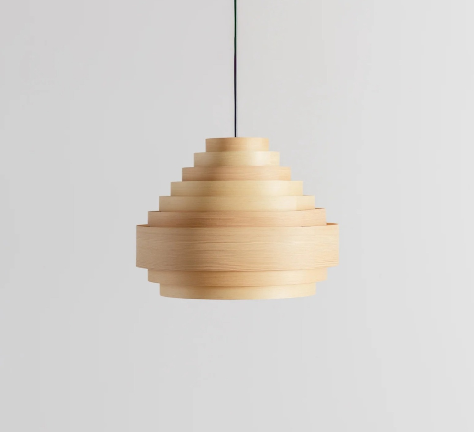 Cette pièce réinterprète la forme conique graphique typique du designer en utilisant du pin finlandais naturel travaillé avec soin, conférant à l’abat‑jour une présence chaleureuse et organique.