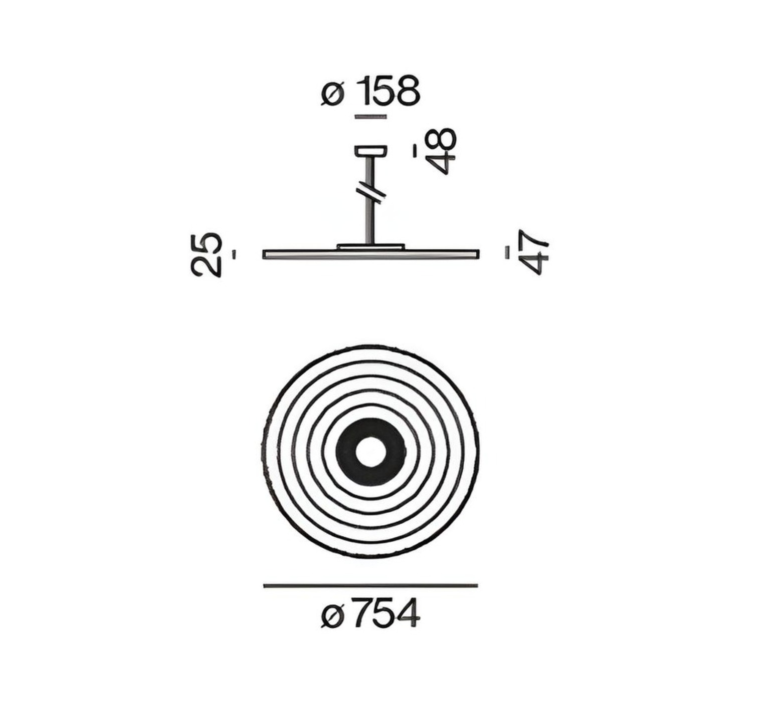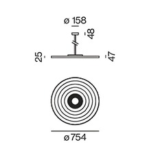 Cette suspension mesure 75,4 cm de diamètre et 4,7 cm de hauteur avec une tige de 97,7 cm.
