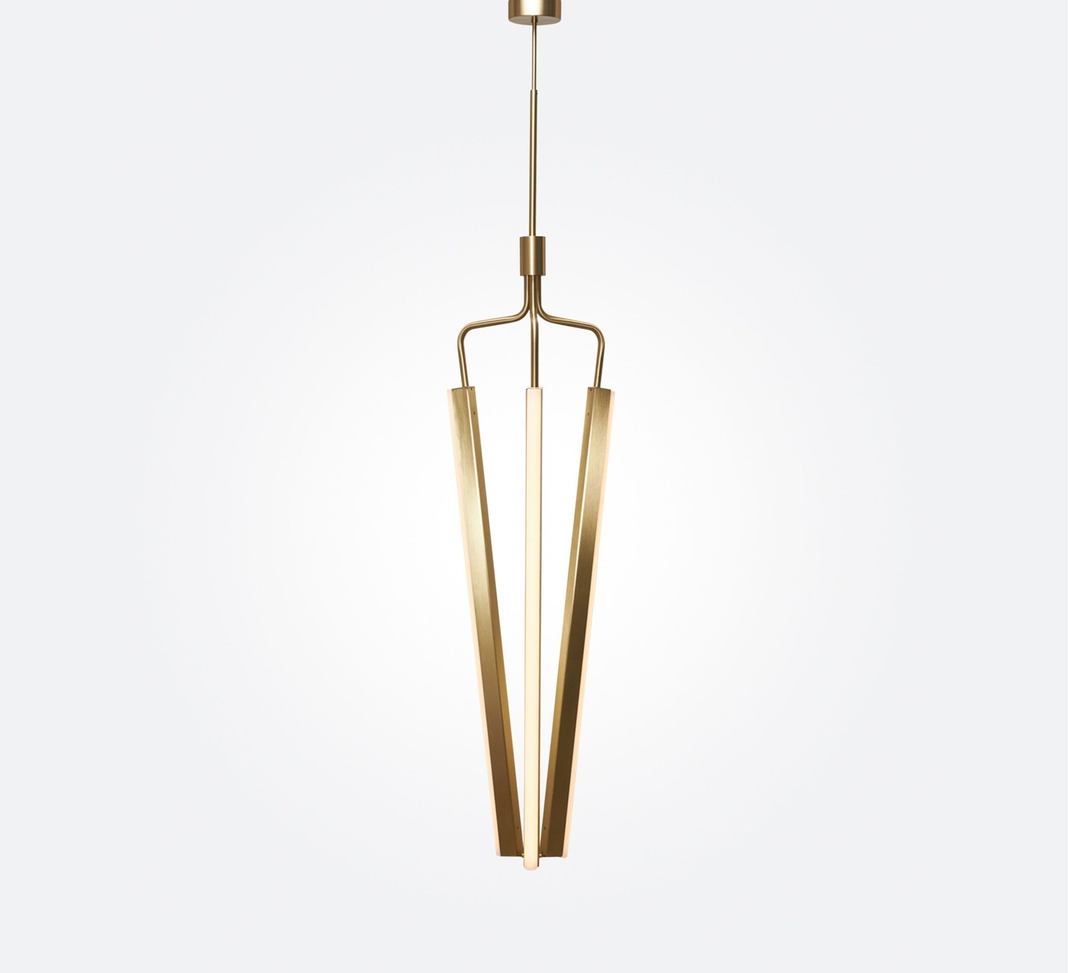 Inspirée des formes angulaires modernes et épurées, sa silhouette graphique propose trois bras métalliques distincts qui semblent en suspension dynamique, presque en tension, évoquant une sculpture lumineuse à la fois puissante et légère.