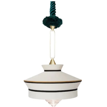 Chaleureuse, la suspension d'extérieur Calypso Antigua XL Menthe prend la forme d'un chapeau atypique. Ses finitions raffinées sont prises en charge par un seul et même artisan qui exerce un travail méticuleux sur le lumianire du début à la fin. Suspendu par une structure en laiton doré, elle même attachée à une soyeuse corde en soie tréssée verte, l'abat-jour charme par ses chics lignes géométriques.