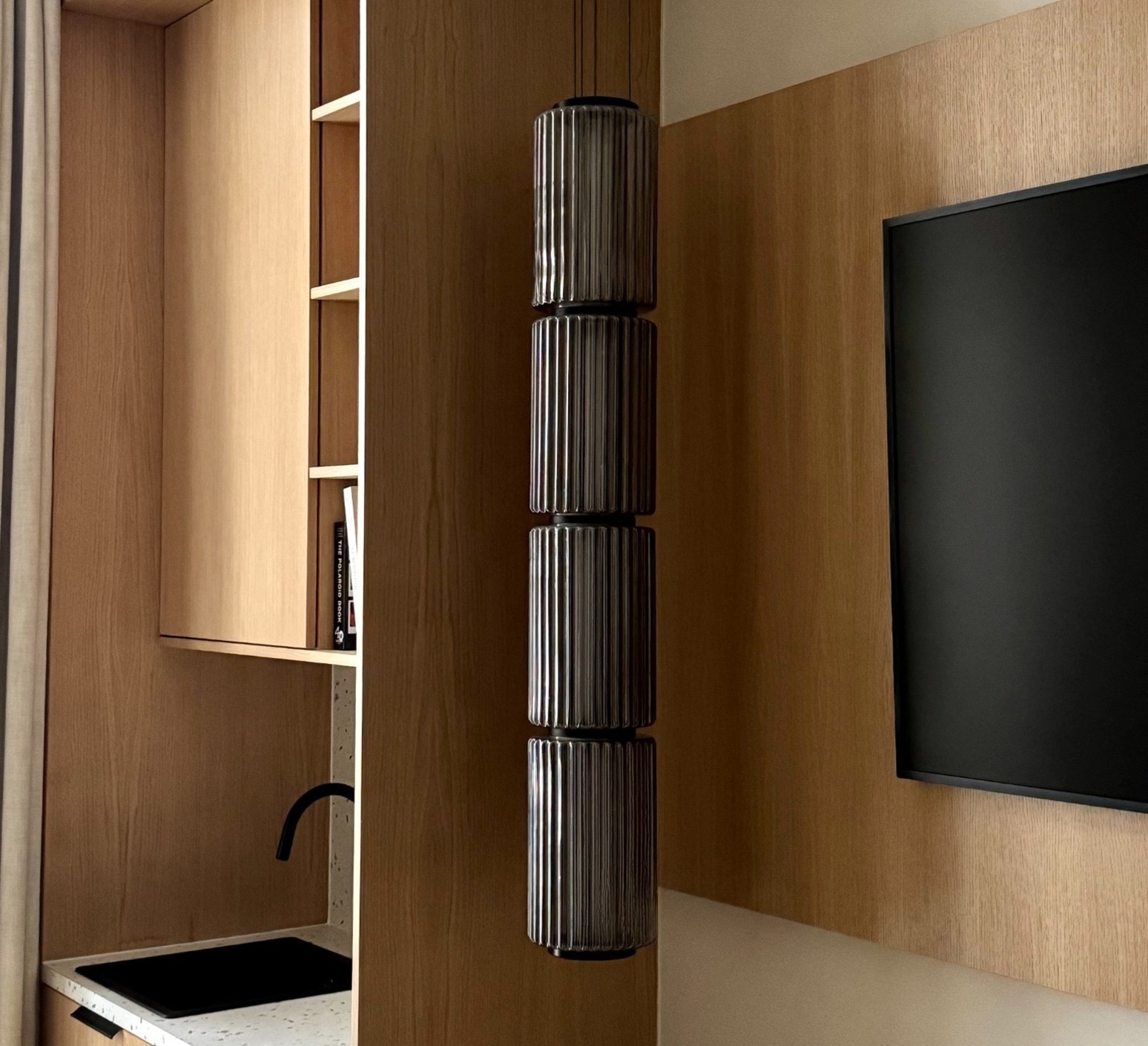 Découvrez l’étonnante suspension verticale Column 175, avec 4 cylindres et finition carbone, imaginée par Lukas Peet pour la maison canadienne A-N-D.