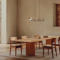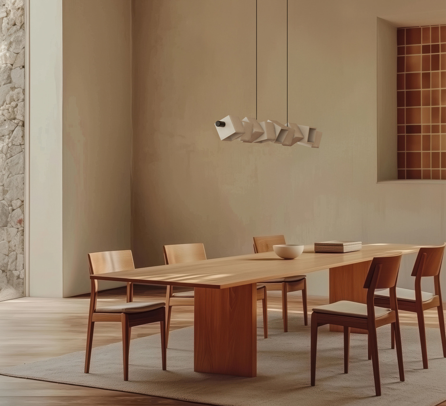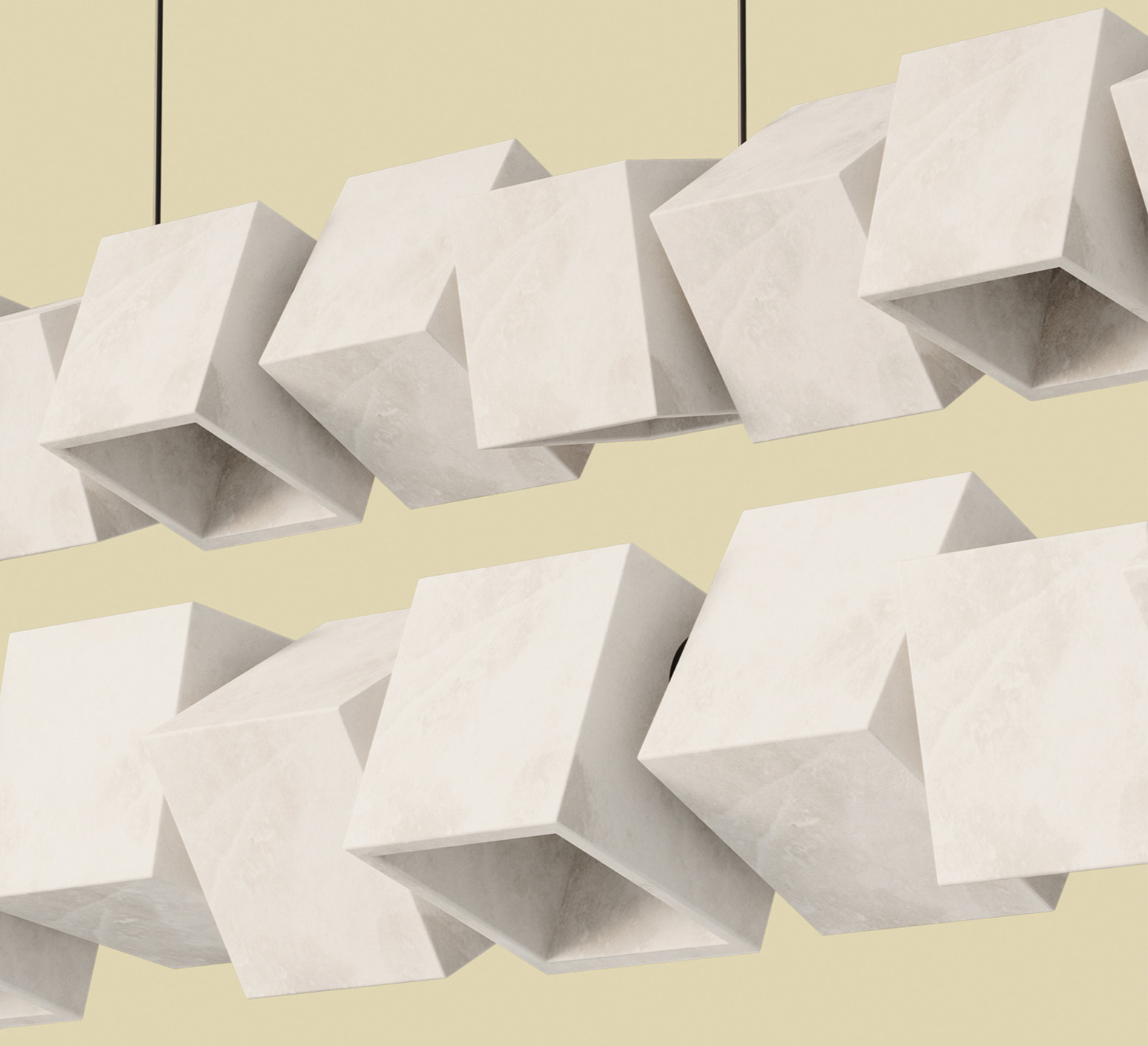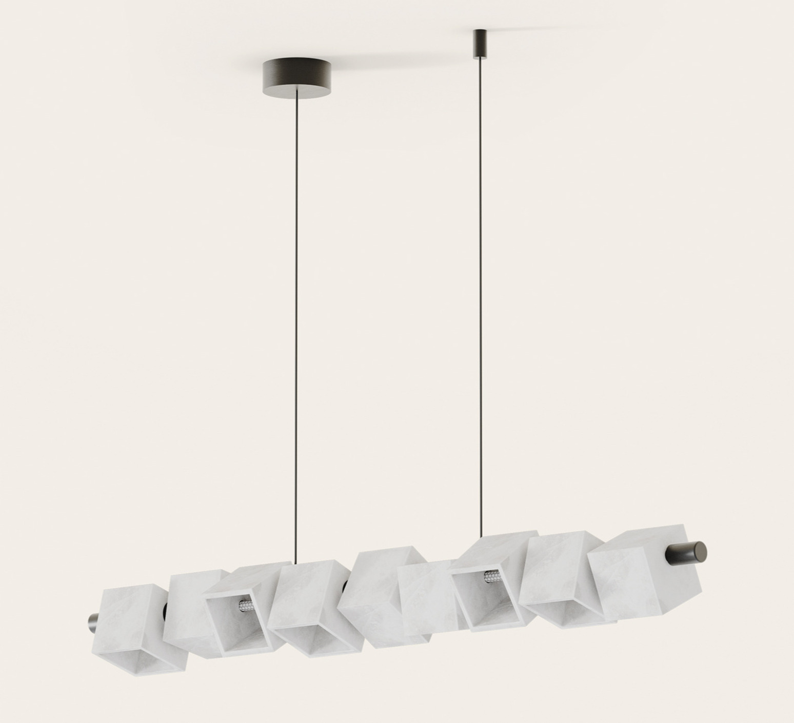 Son esthétique repose sur une succession de sept cubes en albâtre orientables, enfilés sur une structure linéaire en métal finition noir mat. L’albâtre diffuse une lumière douce et chaleureuse, idéale pour adoucir l’atmosphère d’une pièce. Installée au-dessus d’une table de repas, d’un îlot de cuisine ou dans une zone de réception, Cubic crée un point focal sculptural tout en accompagnant l’espace de manière élégante. Son style graphique se prête parfaitement à des décors épurés, contemporains ou minimalistes.