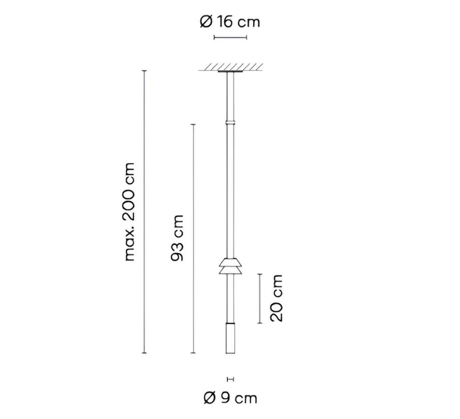 Le luminaire mesure 9cm de diamètre et 93cm de hauteur. Les 2 ampoules LED sont intégrées avec une puissance maximale de 3W chacune, une température de couleurs de 2700K et une intensité lumineuse de 726lm. Dimmable en 1-10V. Installation électrique encastrable.