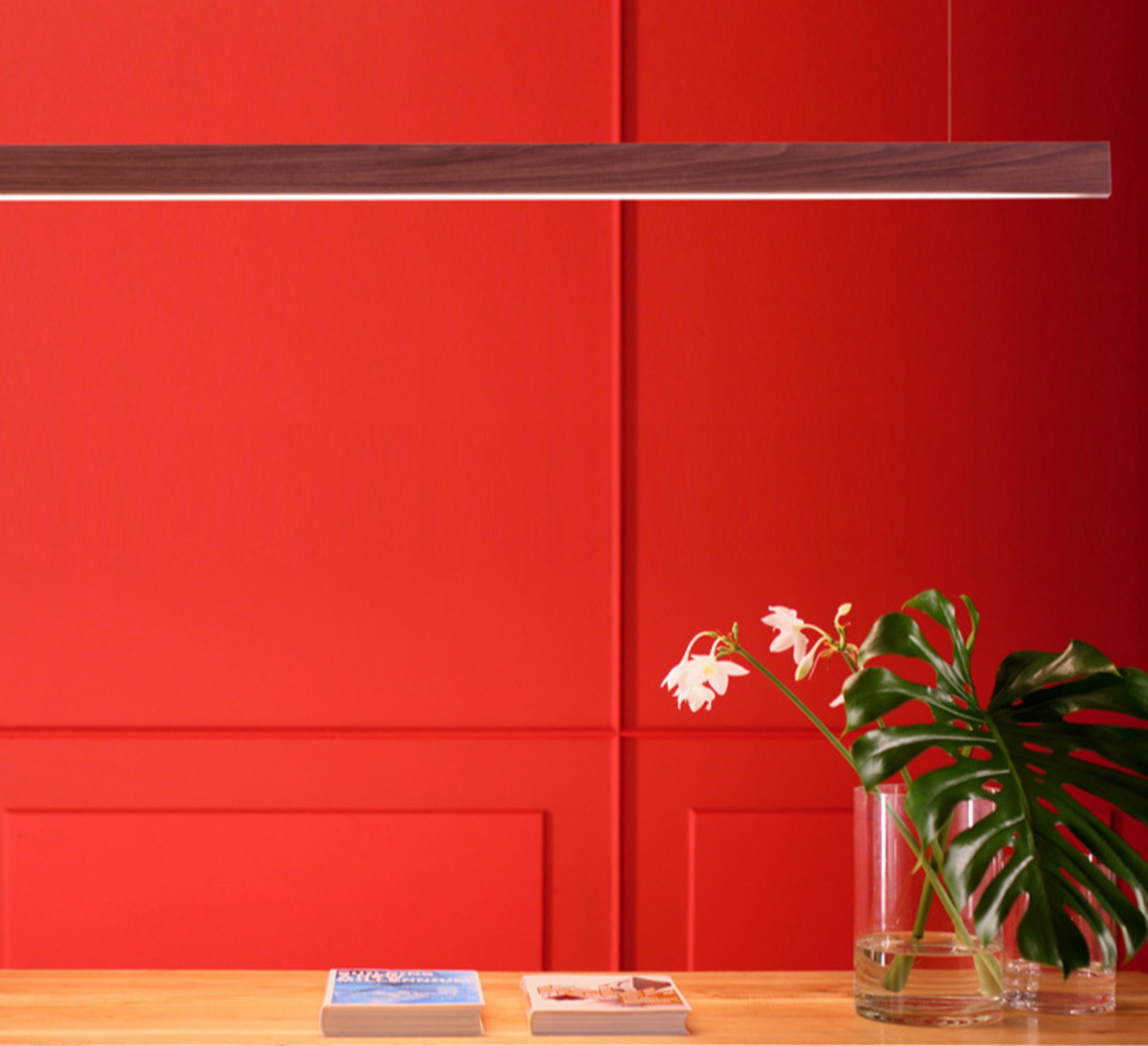 Avec sa forme longiligne et sa finition en bois de noyer, elle apporte chaleur et naturel à l’espace. Sa présence discrète mais affirmée s’harmonise parfaitement avec des intérieurs contemporains ou épurés, au-dessus d’une table ou d’un plan de travail.