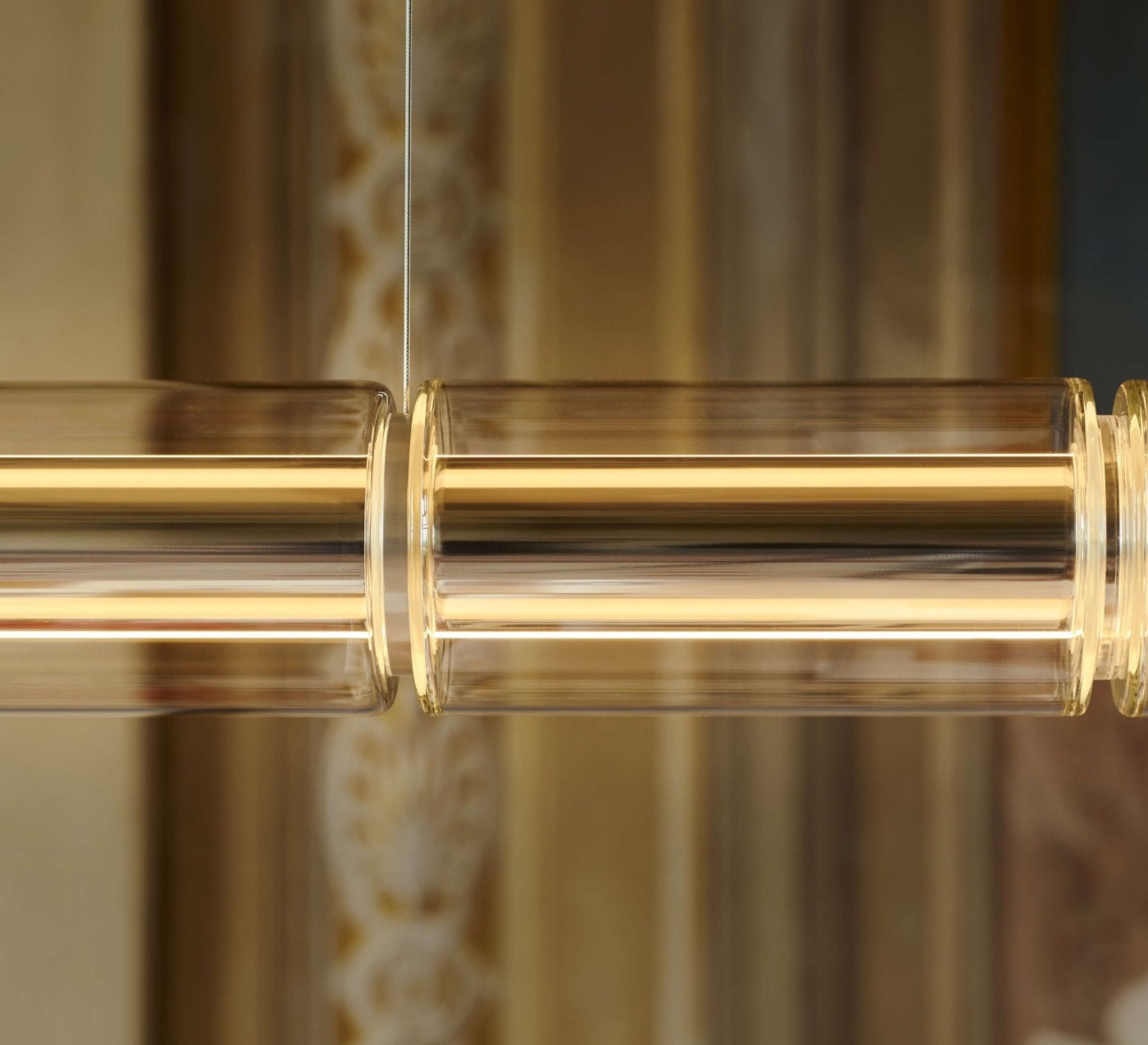 Son cylindre en verre soufflé, délicatement posé sur une structure fine en aluminium, diffuse une lumière douce et enveloppante. Élancée et sculpturale, cette suspension évoque l’image de lanternes suspendues dans les airs, apportant une atmosphère apaisante et raffinée. Plus qu’un luminaire, Luce Cilindrica se perçoit comme une pièce modulable, capable de transformer l’espace avec élégance.