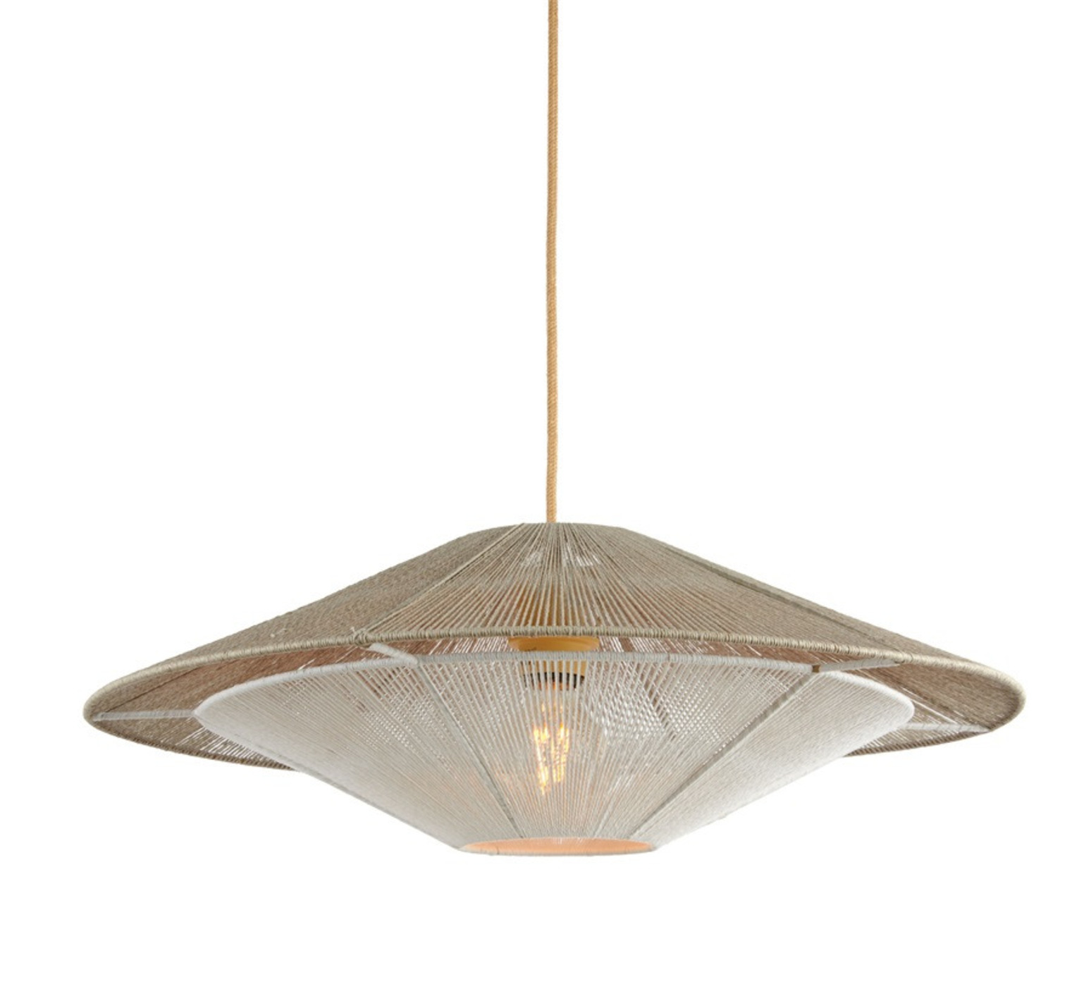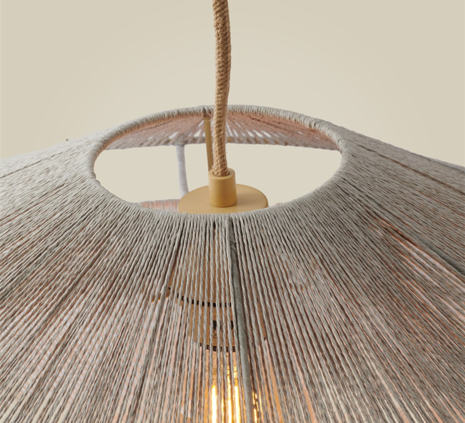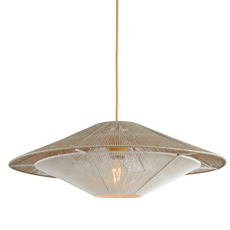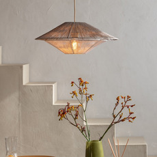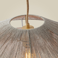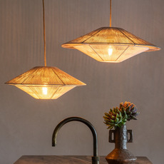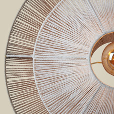 La suspension Lumbini mesure 50 cm de diamètre et 20 cm de hauteur, avec un câble de 2,5 m en corde. Elle offre un éclairage diffus à 360° et ne comprend pas de source lumineuse. Son indice de rendu des couleurs (IRC) naturel valorise les teintes de votre intérieur.