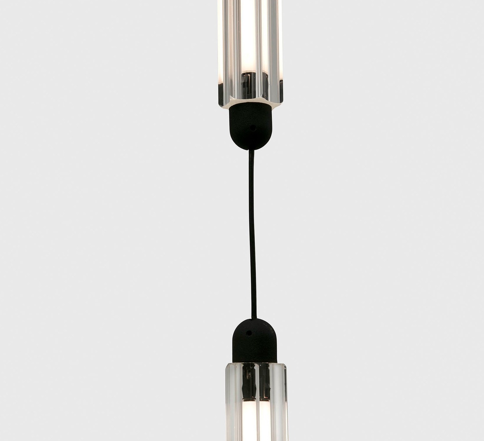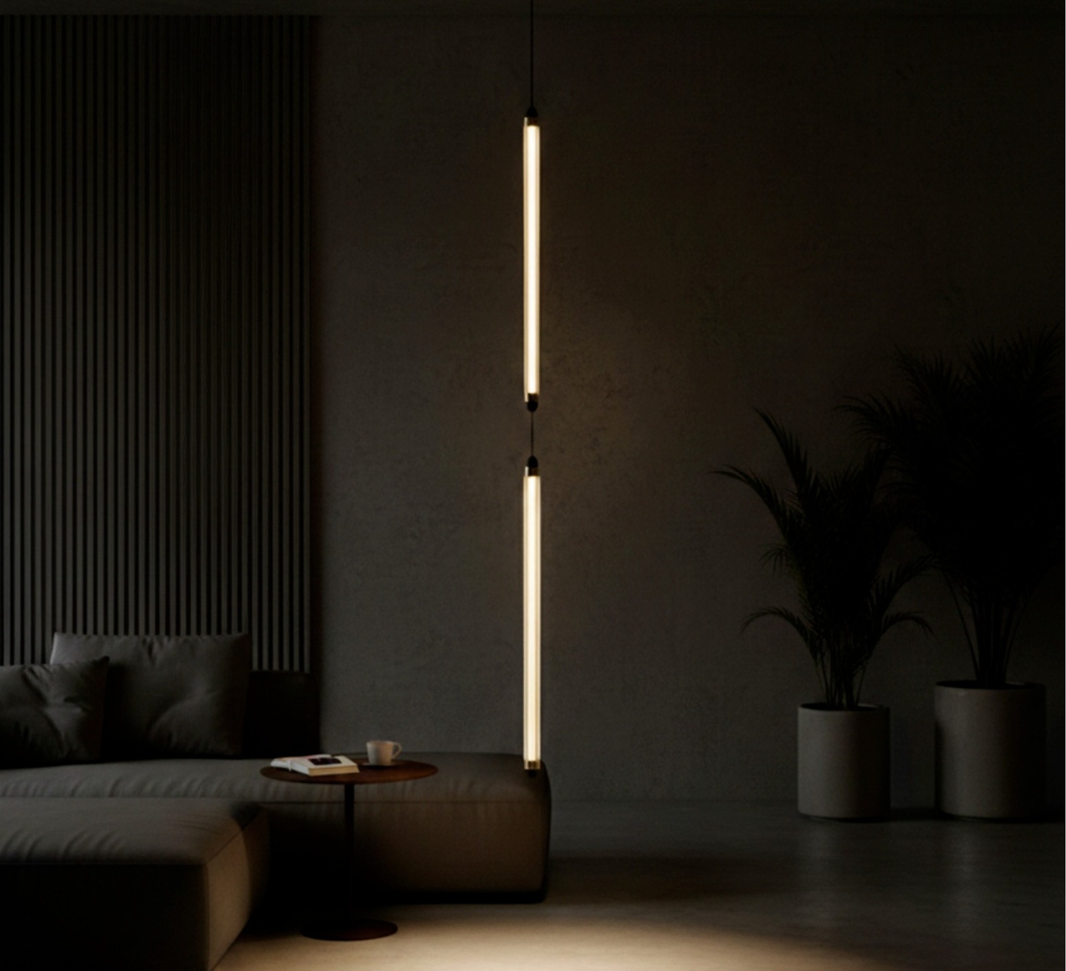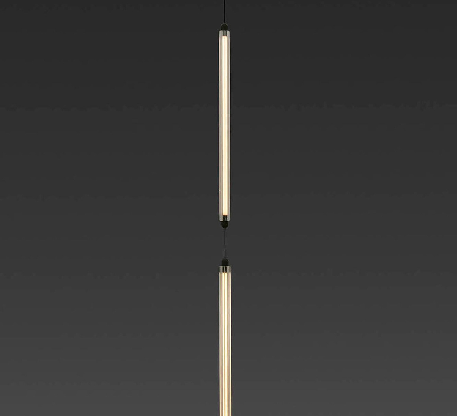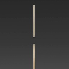 Ce luminaire met en avant une esthétique minimaliste et contemporaine, composée de deux éléments suspendus légèrement courbés qui jouent avec la gravité pour donner une impression de légèreté et de mouvement tout en habillant l’espace avec élégance.