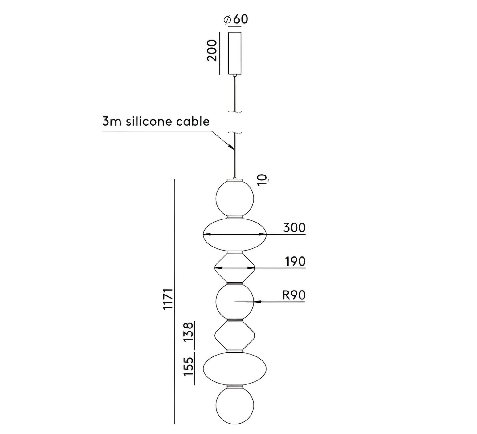 Cette suspension mesure 30 cm de diamètre et 117,1 cm de hauteur. Sa source lumineuse est incluse et diffuse 2700K. Son câble textile est réglable d’environ 3 m pour ajuster la hauteur sous plafond.