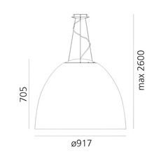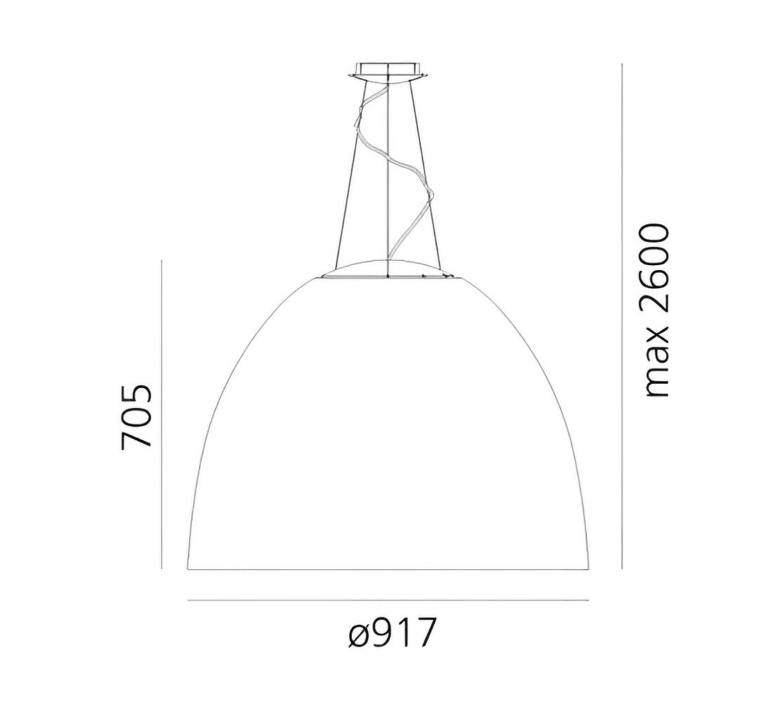 Son large abat-jour permet de diffuser une vaste lumière. Un système LED (80W, 3000 kelvins, 6151 lumens, CRI 90, dimmable) est intégré à la suspension. Le diamètre et la hauteur sont respectivement de 91,7 cm et 70,5 cm.