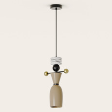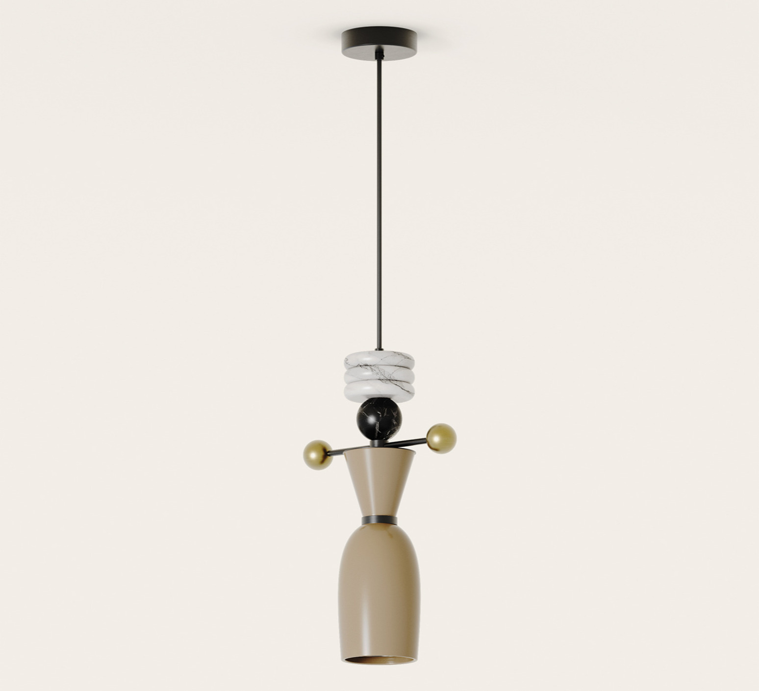 D’un profil cylindrique et résolument sculptural, cette version associe le verre finition silhouette à la noblesse du marbre, combinant trois disques en marbre blanc et une boule en marbre noir dans une composition verticale équilibrée. Le contraste entre la clarté laiteuse du verre et la profondeur du marbre noir crée une présence élégante qui structure l’espace, s’intégrant aussi bien au-dessus d’une table, d’un îlot ou dans une entrée au style graphique ou minimaliste.