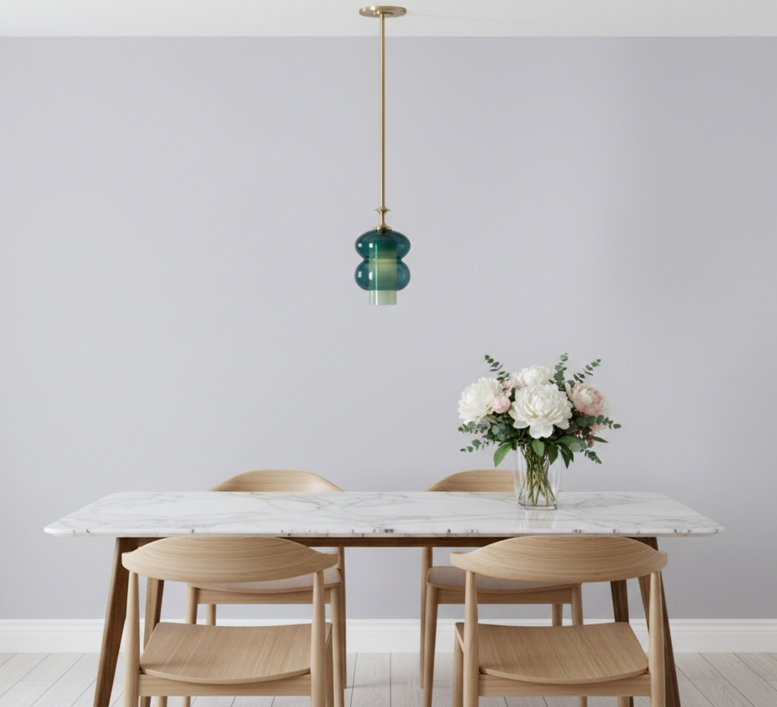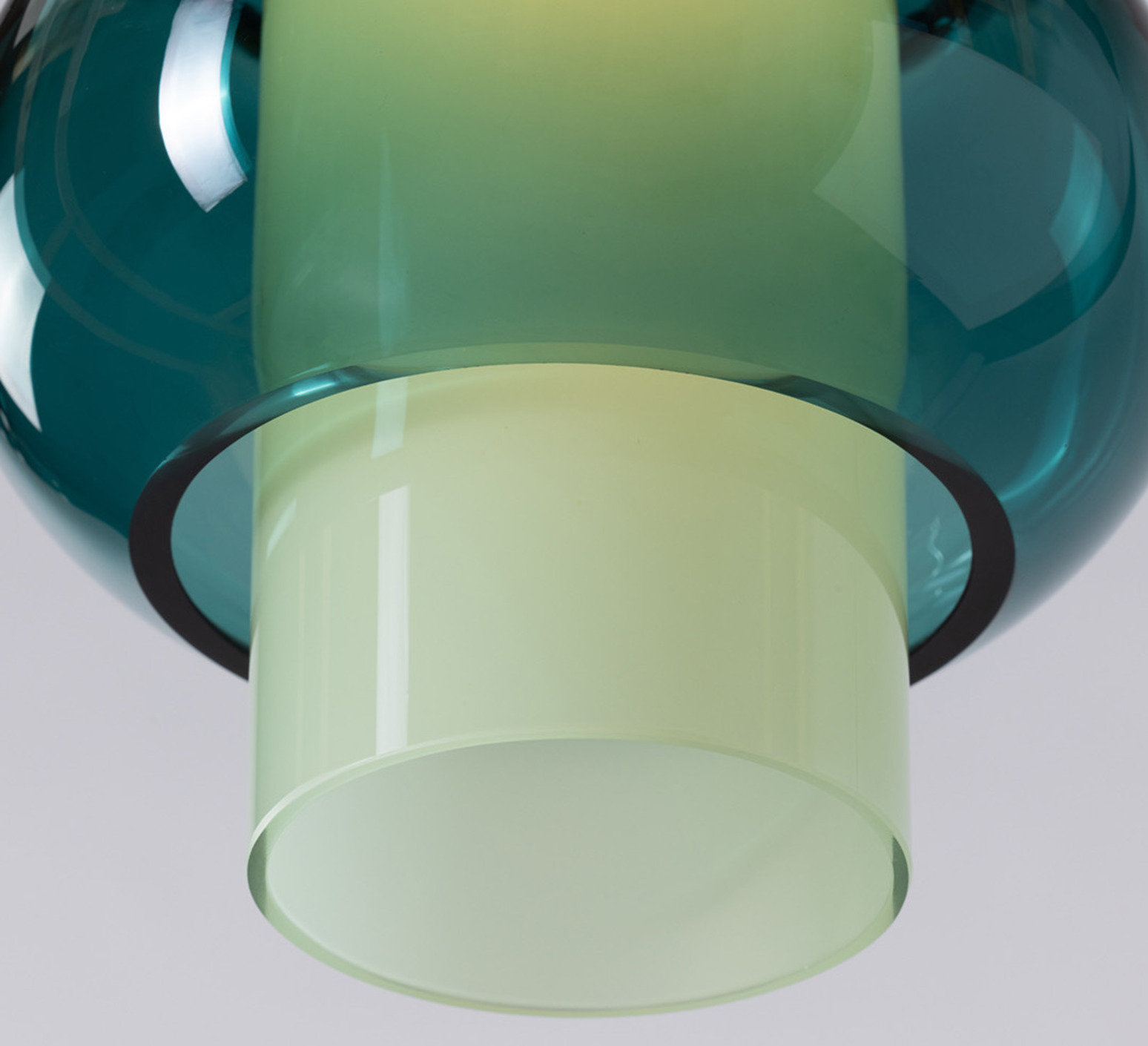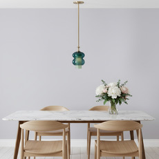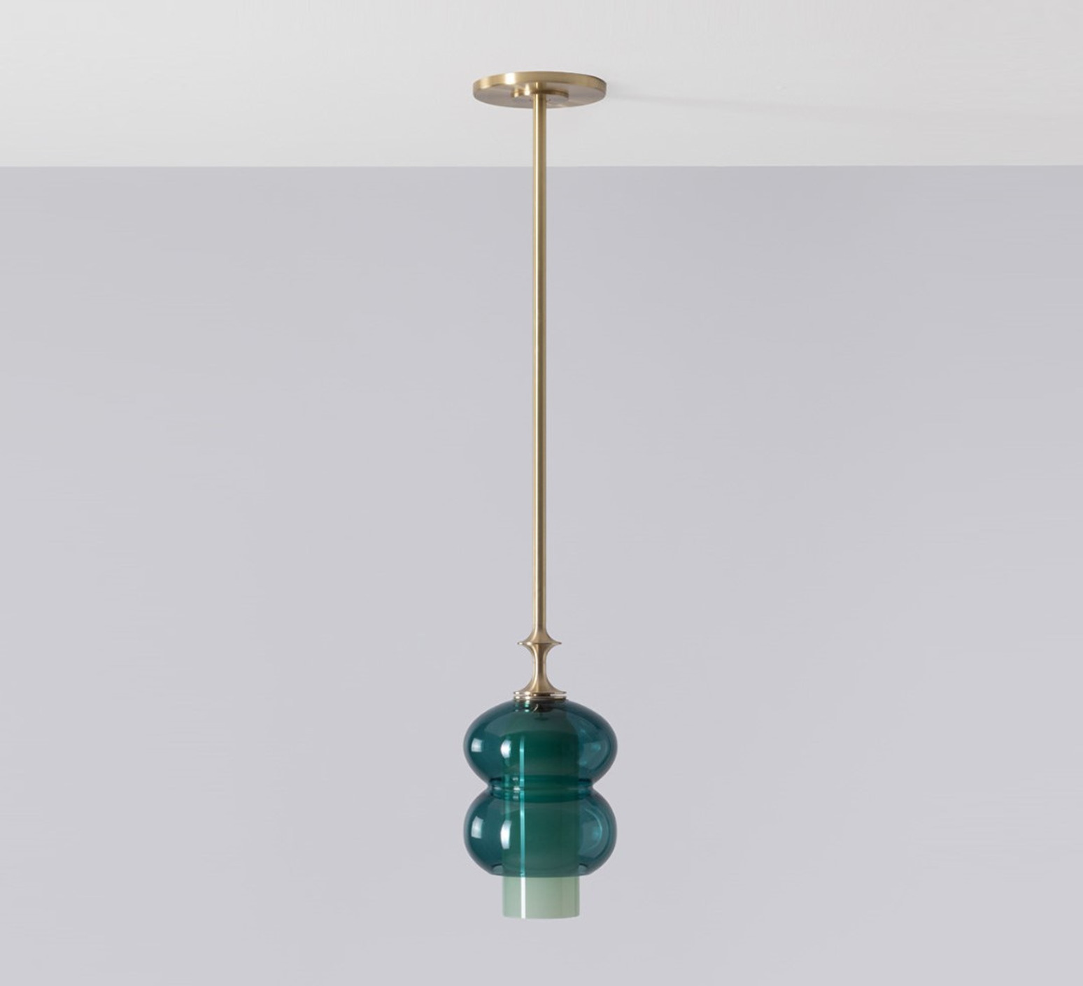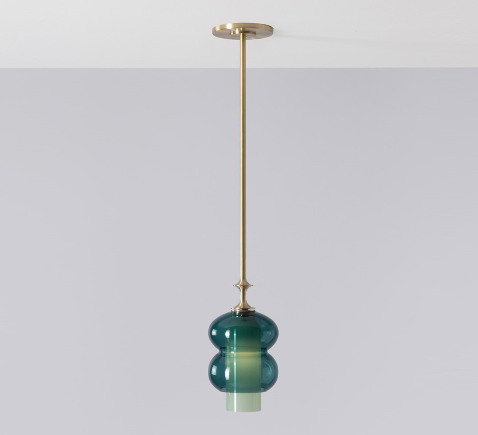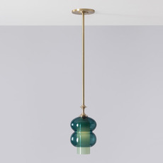 Son design cylindrique superpose les jeux de formes et de transparence : un diffuseur extérieur aux lignes ellipsoïdales en verre teinté vert sapin enveloppe un cylindre intérieur en verre opaque, dont la lumière irradie subtilement à travers la matière. La tige de 1,2 mètre maximum en laiton brossé prolonge l’ensemble avec élégance et apporte une touche décorative raffinée. Cette suspension s’intègre parfaitement au-dessus d’un îlot, d’une table ou en composition pour structurer un espace avec douceur.