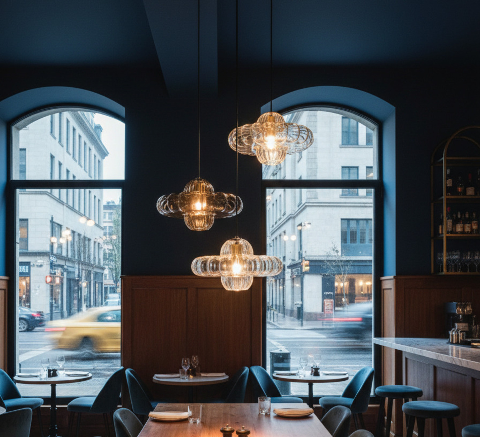 Cette suspension décorative de trois abat-jours s’intègre dans les intérieurs contemporain.