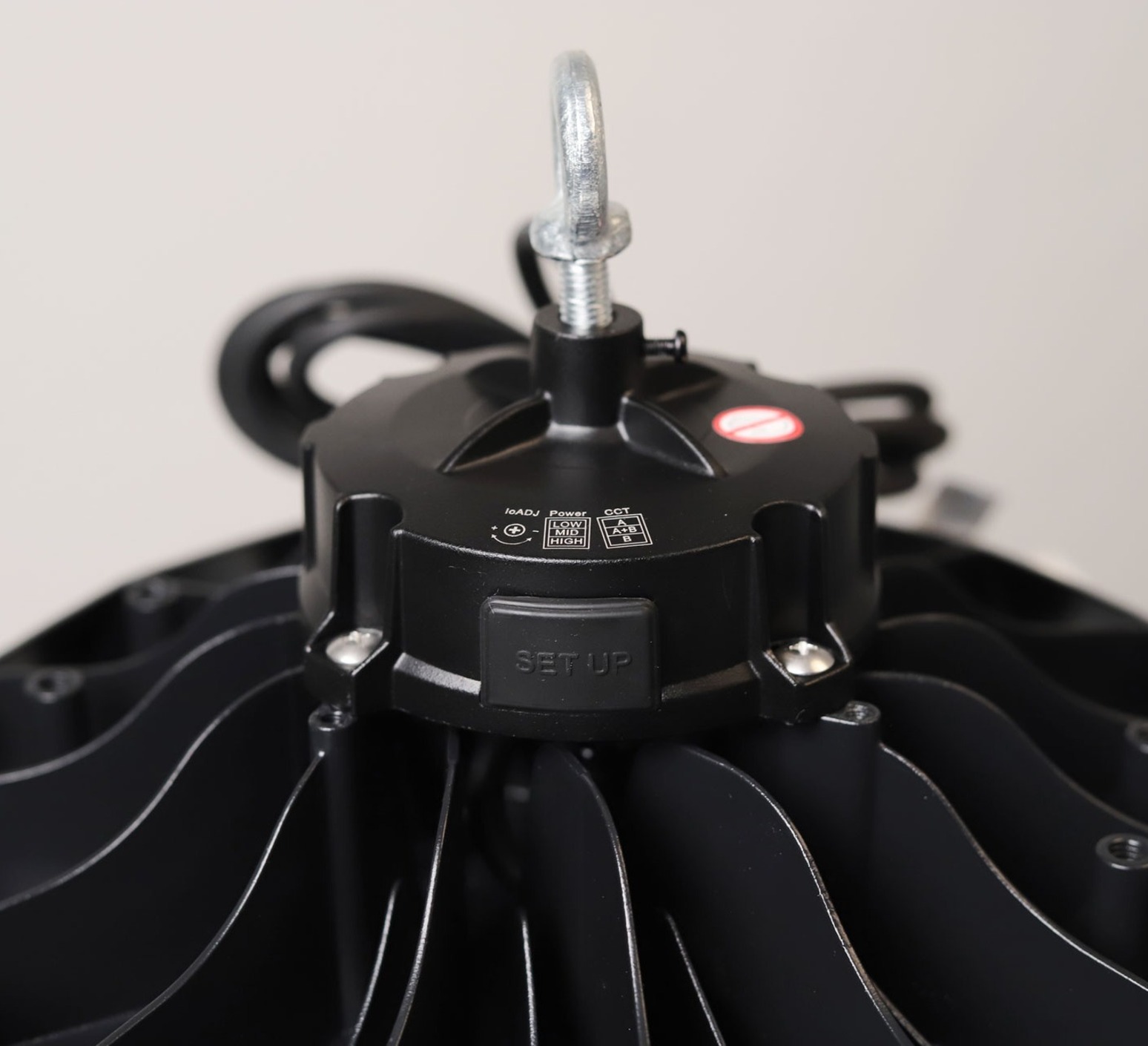 La suspension UFO Lens Switch propose une puissance LED réglable de 120 W, 160 W ou 200 W avec un rendement lumineux élevé (jusqu’à 169 lm/W selon configuration). Elle fonctionne en 100-260 V, offre une durée de vie moyenne de 50 000 heures et est certifiée IK10 pour une excellente résistance aux chocs. Sa structure en aluminium et polycarbonate assure robustesse et durabilité pour un usage intensif, tandis que la fixation en suspension est facilitée par ses accessoires inclus.